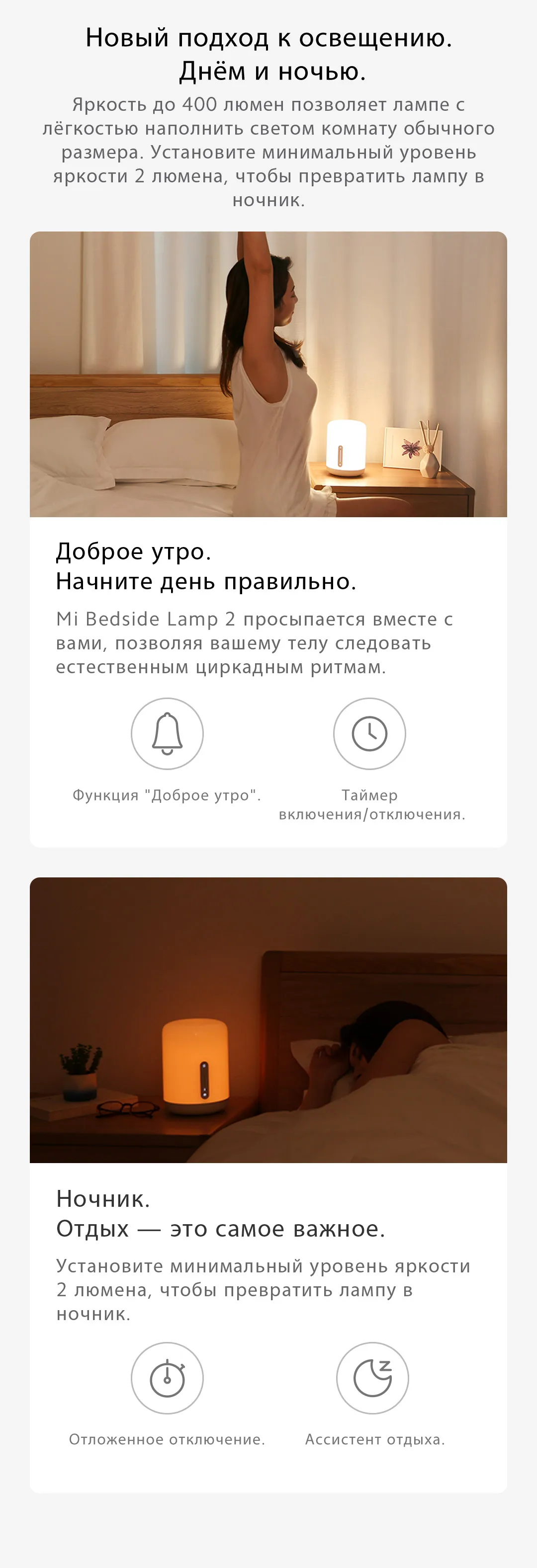 Это мое первое умное устройство, и в целом я довольна. Приложение Mi Home, в котором настраивается светильник, доступно на русском языке. Google Ассистент подключился без проблем. Много возможностей регулировки цвета и яркости, но вот имитацию рассвета настроить на устройстве так и не удалось. Со стандартными режимами там все очень неудобно. Еще неудобно, что работает только от сети, без аккумулятора.