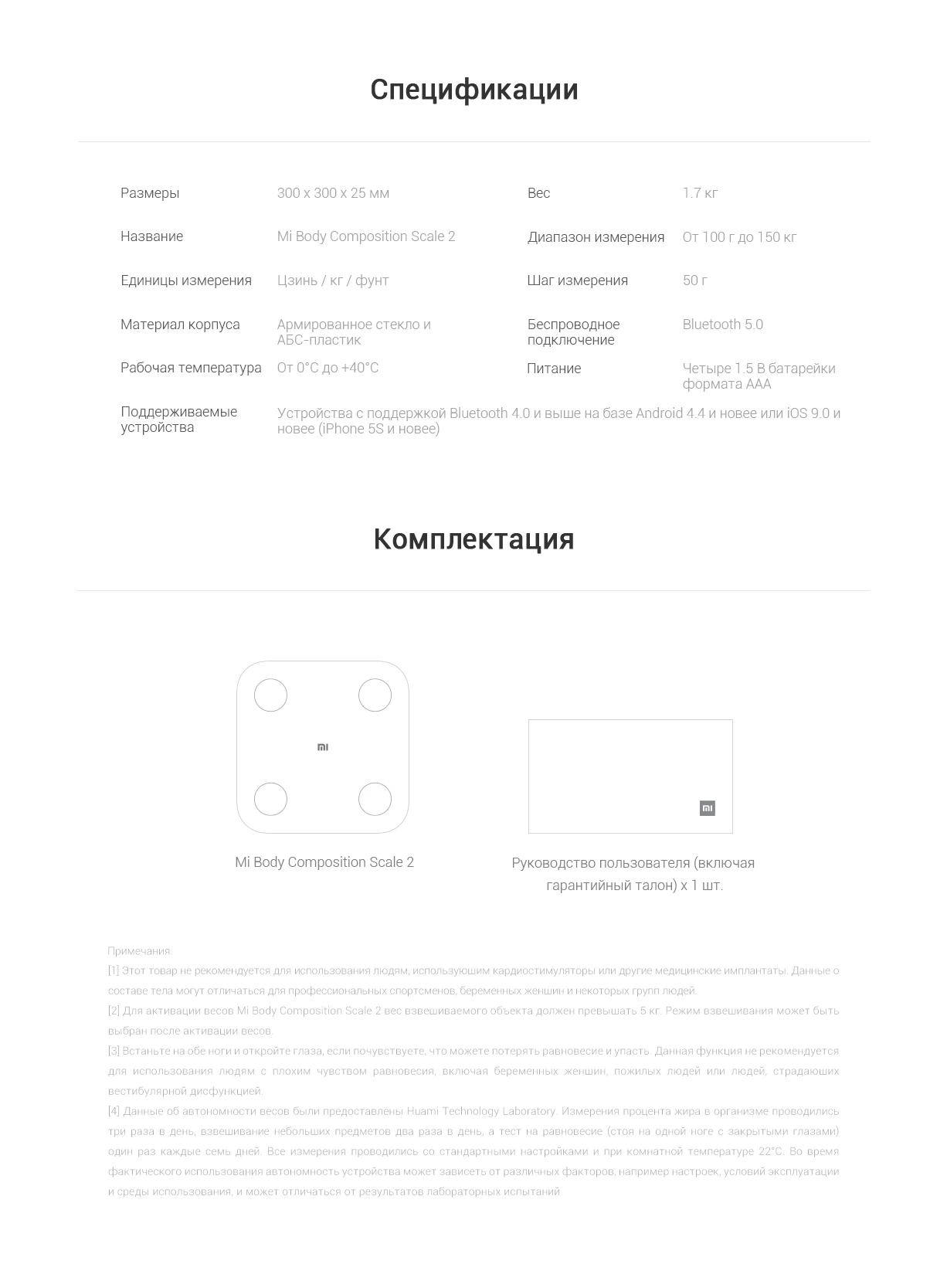 Весы Xiaomi Smart Scale 2, Bluetooth 5,0, Поддержка Android 4,3, iOS 9