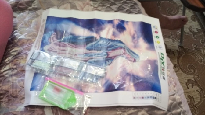 Посылка пришла быстро,в хорошем состоянии не помята, товаром довольна продавца рекомендую, картину уже собрали правда один нюанс не хватило стразиков, но дополнил своими, получилось очень даже неплохо