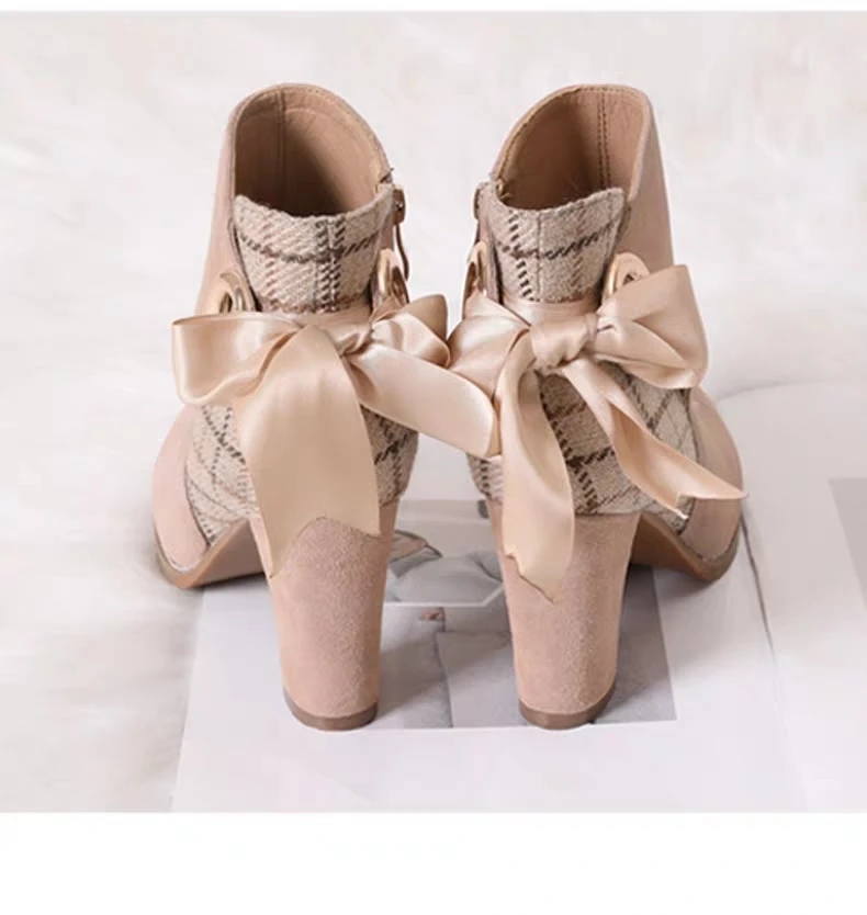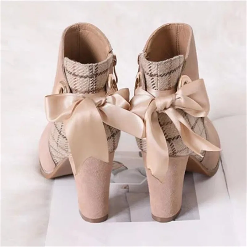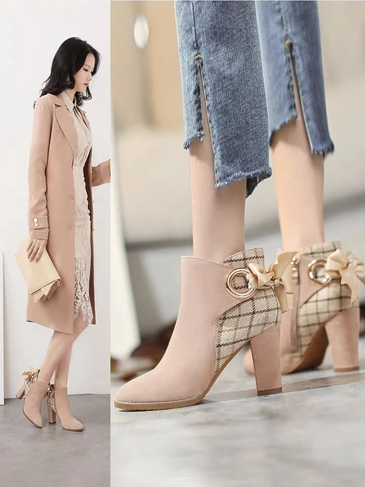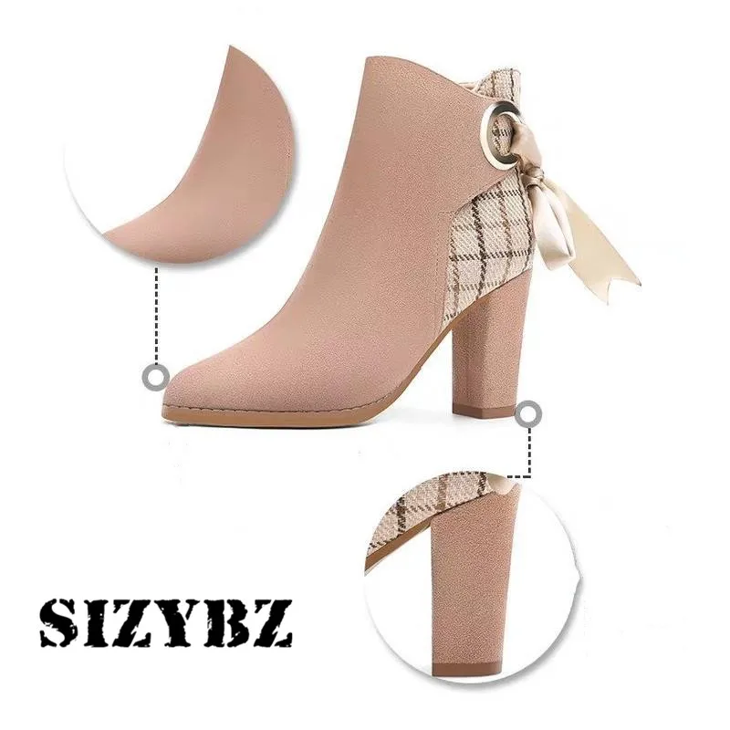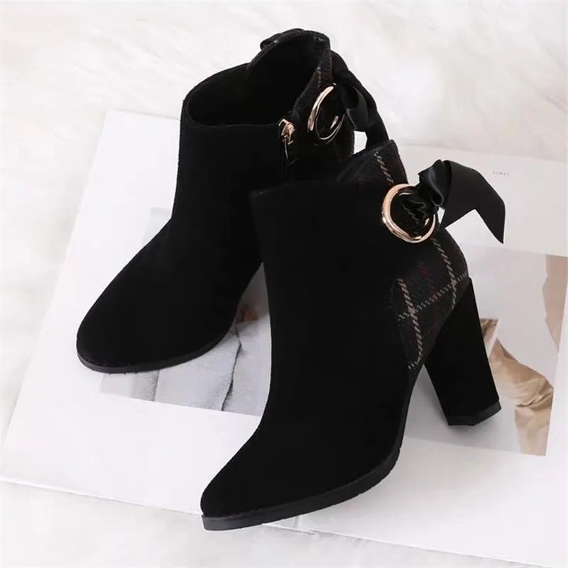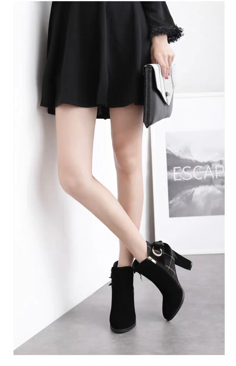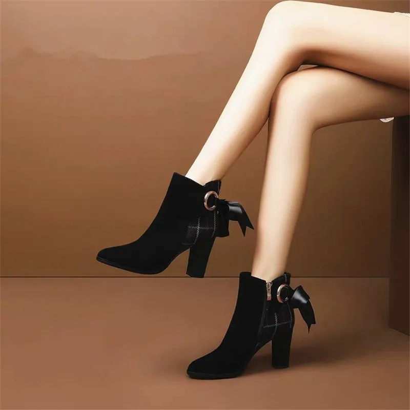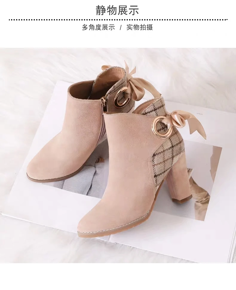 Женские замшевые ботинки из флока, Теплые ботильоны на высоком каблуке, с бантом-бабочкой, большой размер 34-42, для зимы, 2019
