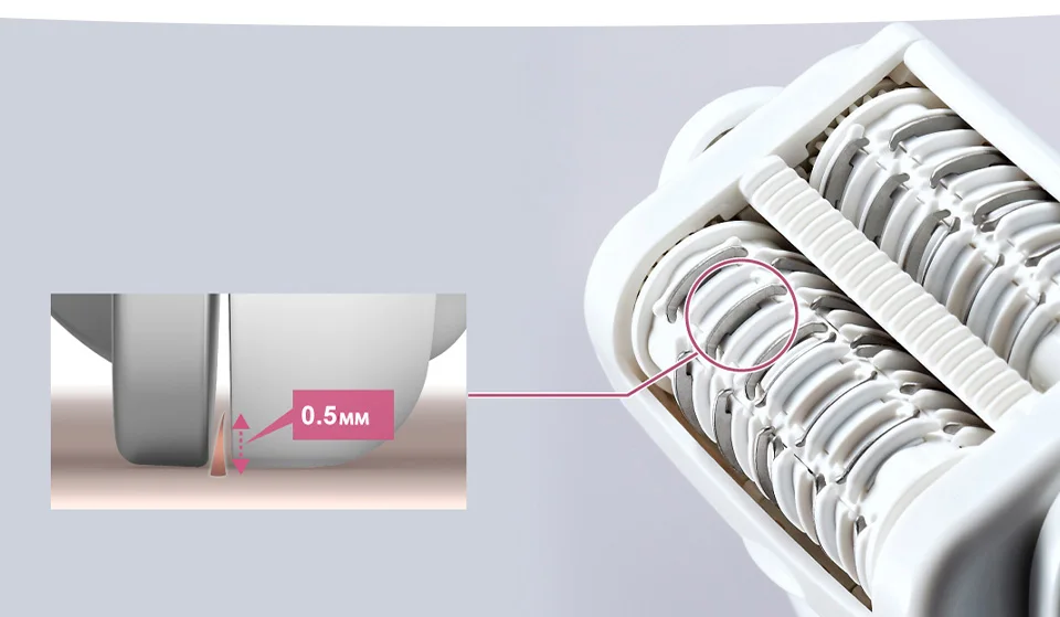 Головка может изменять угол наклона до 90°, оставаясь плотно прижатой к коже. Она идеально повторяет любые контуры тела, не оставляя пропущенных волосков, а также позволяет без особого труда эпилировать труднодоступные места.