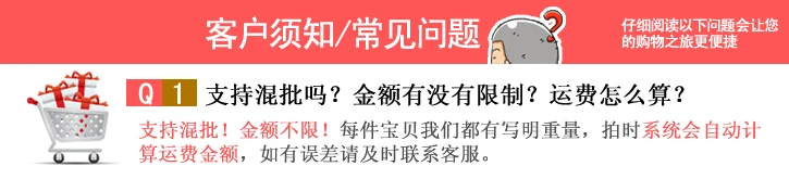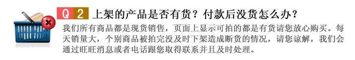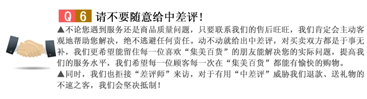 差问题:所有商品都是实物拍摄,尽量让颜色看起来接近实物,对一点色差都不能容忍的顾客请慎重!以免超成不必要的金钱时间浪费.2.尺寸问题:请买家再购买前详细看产品说明或与我们先沟通,拍买时请说明你要的产品颜色和尺寸,否则我们将默认按标题描述发货.3.快递问题:快递因所在城市不同,运送速度也不一.特别是遇到恶劣天气以及法定节假日,都会有延迟耽搁现象.另外快递公司每个网点的业务员素质也不一,中间可能出现个别网点业务员态度不好或者包裹损坏等,一些卖家无法预知的意外因素.总之有什么不愉快请联系我们,我们会积极跟快递公司沟通解决的.4.商品丢失:一般出现商品丢失情况都是因为包裹被破坏造成,如果发现包裹胶带被替换毁坏或者被撕开,断裂,有拆封的痕迹,请不要签收.如果包裹未经核查就签收那出现的商品缺失.短少或者运输造成的事故,我们很难承担责任,希望大家理解.如果是保安或者代签的,请事先告知他们校对包裹内的商品.5.质量问题:能拆开的东西发货前我们都会尽量拆开再三核对和严格检查,尺寸和颜色问题不是我们发货疏忽引起的,如需调换运费由买家承担,如果确实在收到后发现质量问题请在收到的 48 小时内及时联系我们,提供相关图片证据,一定为您妥善解决,邮费我们承担.注意:内裤和袜子不接受任何使用后的调换和退货!请在适用前仔细检查!由于每个顾客要求不同,是不可能做到在任何顾客眼里都是十全十美的.某些丝毫不影响穿着适用的小瑕疵希望各位不要太认真计较.6.关于评价:我们会尽一切的努力以价格质量,以德服人,创造公正和谐的购物环境,升级国民的购物环境和习惯,网上购物好处多,需要大家共同珍惜共同去努力维护,用良心去对待每一笔买卖行为!我们将努力追求 100% 好评,十分欢迎大家对我们合理评价.确实交易出了问题,先要取得沟通,化解误会和矛盾,可以协商解决,是我们的疏忽和责任我们会认真负责对待.理解和尊重是相互的!对某些心怀不轨和阴谋的买家请远离这片净土!联系我们:QQ: 937920322(注明客户) 手机:18967498867(可收短信) 在线时间:早上 9 点 -- 凌晨 1 点