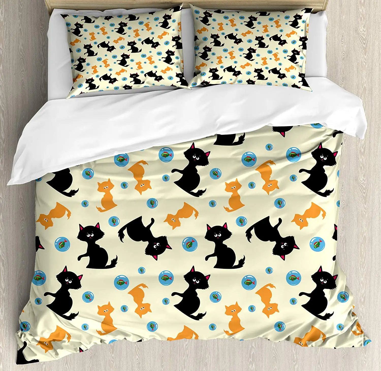 Комплект пододеяльников с изображением кошек, домашних животных, с оранжевыми и черными кошками, рыбами в пузырьках, мультяшный стиль, декоративная кровать из 3 предметов