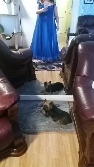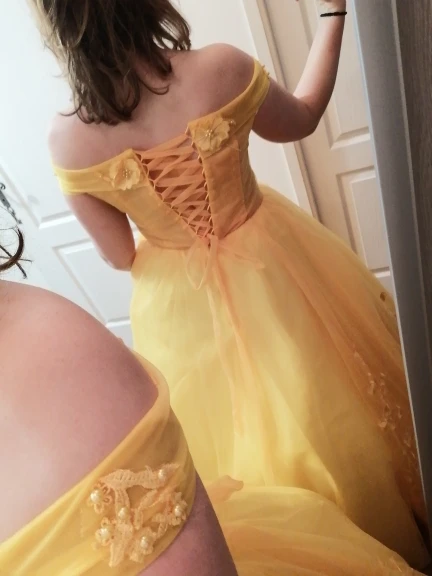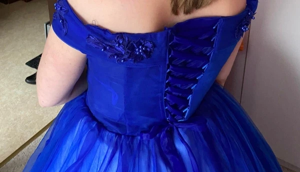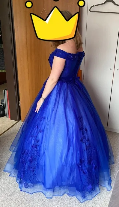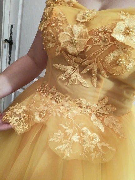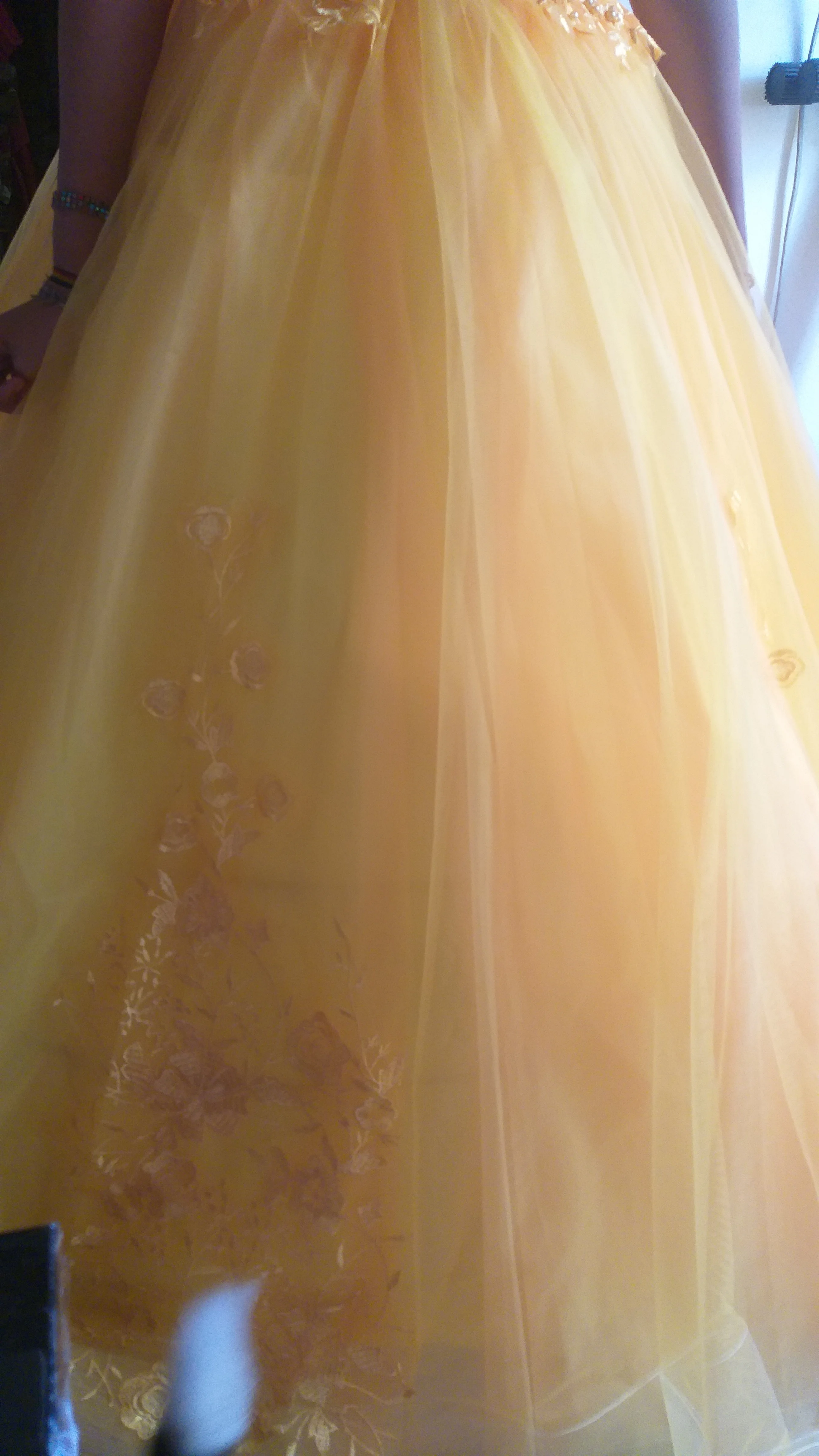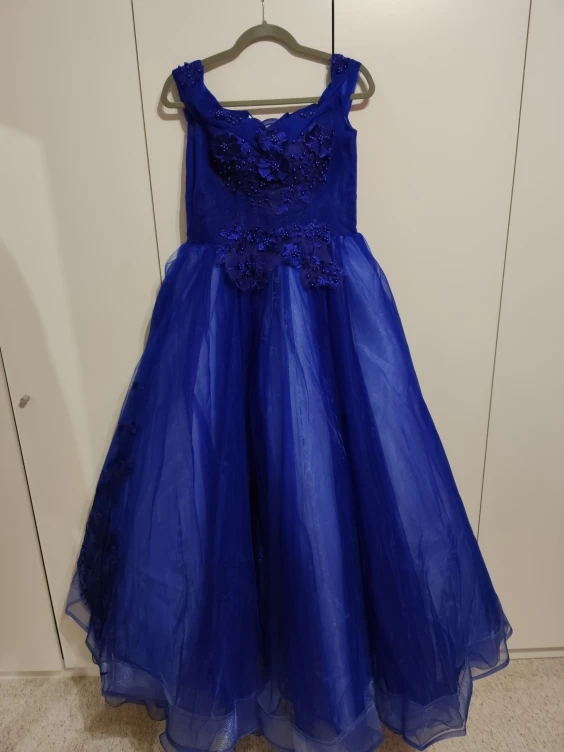 Очень отличное платье. Вы можете увидеть белые нижние юбки, но я считаю, что это неплохо. Платье очень объемное и фантастическое. Кринолин будет доставлен, немного короткий, но точно подходит. У меня рост 1,56 см, а обувь на высоком каблуке разгладила платье, а не пол. Синий очень прочный и красивый. Качество изготовления хорошее, царапины только немного