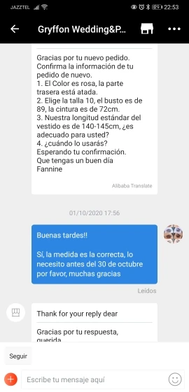 Почти идеальный предмет! Отделка с точки зрения размера .... Несуществующие, вышивки держатся с несколькими нитями и не вписываются в платье Несмотря на это, я нахожу это все еще идеальным Общение с продавцом тоже, я упал на очень хороший человек, который помог мне выбрать размер и предложил сделать его на заказ без дополнительных затрат Несмотря на это, я взял Размер 12, без изменений, для 93 см в груди и 76 в талии, и он подходит мне идеально! Действительно очень доволен, несмотря на небольшие недостатки ....