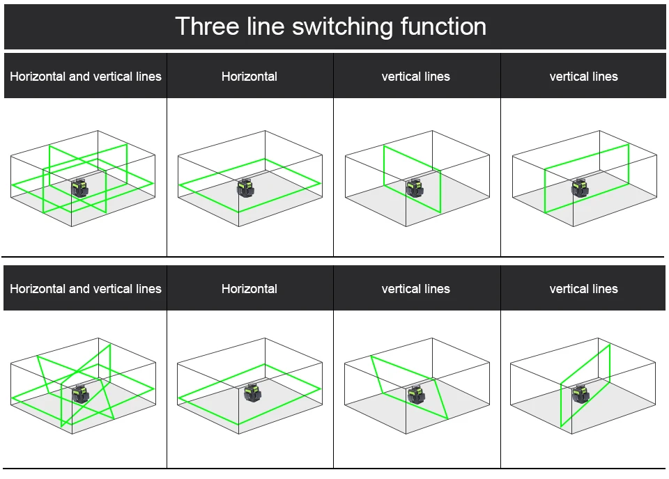 ➤ Каждый раз, когда кнопка питания нажимается один раз, лазерный инструмент проектирует 360 ° горизонтальных линий, 360 ° вертикальных линий и 360 ° вертикальных линий в последовательности.➤ 360 ° крышка горизонтальная линия и 360 ° вертикальная линия и 360 ° вертикальная линия (H360 °/V360 °/V360 °)