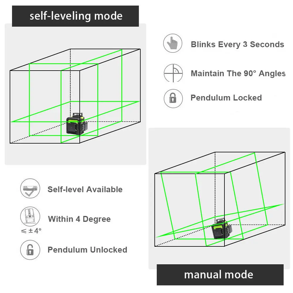 ➤ Самовыравнивающийся режим:Разблокируйте маятник, включен режим самонивелирования. Лазерный луч будет мигать непрерывно при 2 Гц, когда инструмент находится за пределами диапазона самонивелирования (4 ° ± 1 °).➤Manual режим:Заблокируйте маятник, вы можете (использовать штатив или другой кронштейн) разместить лазерный инструмент под разными углами для проекта неуровневых прямых лазерных линий. Разрезы могут быть проецированы. Лазерный луч мигнет каждые 3-5 секунд, чтобы напомнить вам, что сейчас он не самонивелирующийся.