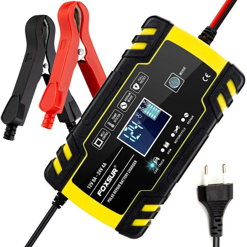 Автомобильное зарядное устройство для аккумуляторов FOXSUR, 12 В, 24 В, 8 А, тип для ремонта аккумуляторов мотоциклов, Мощное зарядное устройство для аккумуляторов для запуска и остановки