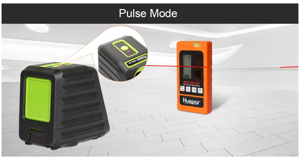 Unlock Разблокируйте маятник, нажмите и удерживайте кнопку питания (около 5 секунд), чтобы включить импульсный режим, затем включите красный.➤Когда требуется наружная работа (приемник должен быть приобретен отдельно), лазерный приемник LR635 может получать импульсы.Frequency частота приемника составляет 10 кГц, а бренд Huepar-лучшее сопряжение.