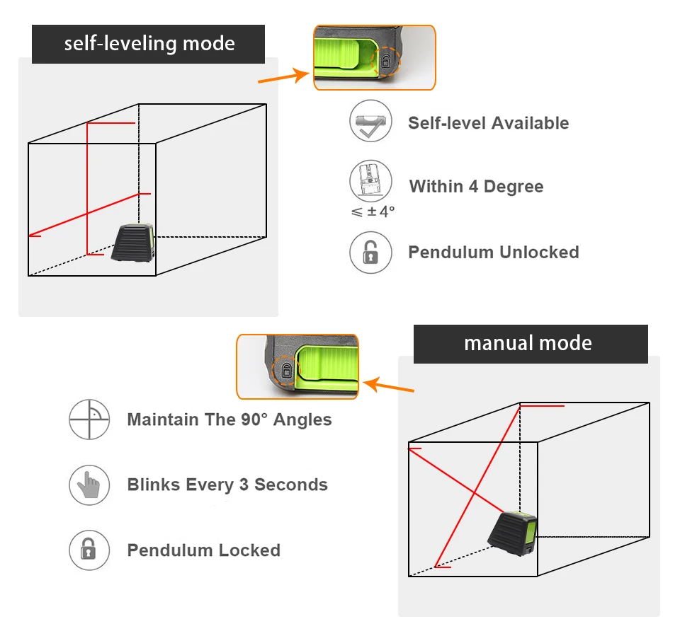 ➤ Самовыравнивающийся режим:Разблокируйте маятник, включен режим самонивелирования. Лазерный луч будет мигать непрерывно при 2 Гц, когда инструмент находится за пределами диапазона самонивелирования (4 ° ± 1 °).➤Manual режим:Заблокируйте маятник, вы можете (использовать штатив или другой кронштейн) разместить лазерный инструмент под разными углами для проекта неуровневых прямых лазерных линий. Разрезы могут быть проецированы. Лазерный луч мигнет каждые 3-5 секунд, чтобы напомнить вам, что сейчас он не самонивелирующийся.