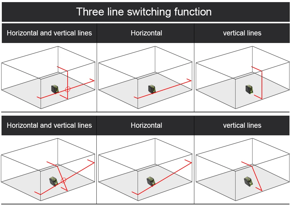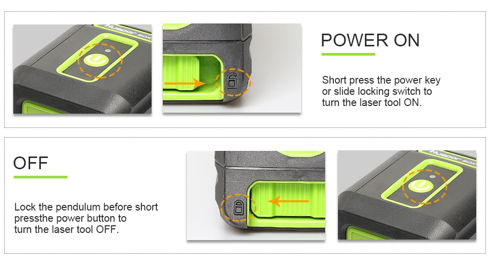 ➤Как включить питание: короткое нажатие кнопки питания или переключатель блокировки скольжения для включения лазерного инструмента.➤Как Переключить линию: после включения, короткое нажатие выключатель питания один раз в раз, лазерный инструмент будет проектировать горизонтальные линии, вертикальные линии и поперечные линии в свою очередь.➤Как включить импульсный режим: после включения питания, нажмите кнопку питания, когда синий светильник включен, импульсный режим включен.➤Как выключить питание: зафиксируйте маятник перед коротким нажатием кнопки питания, чтобы выключить лазерный инструмент.