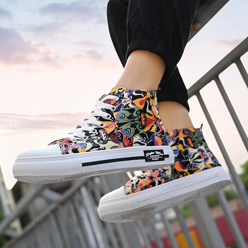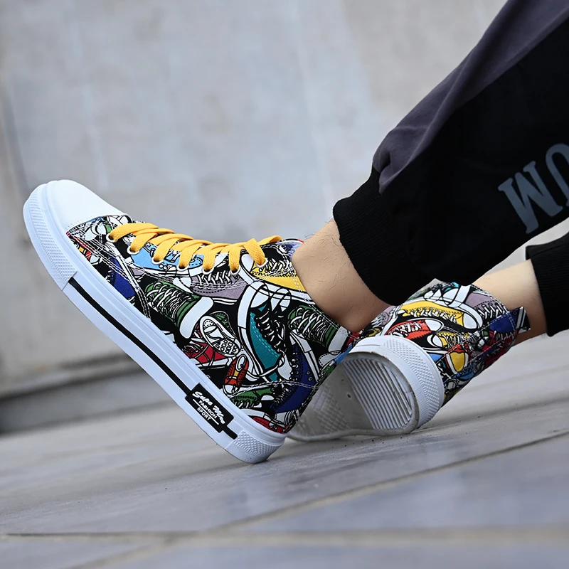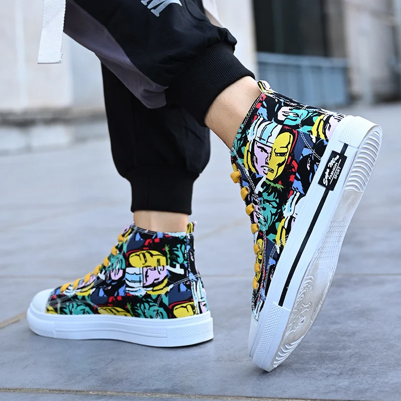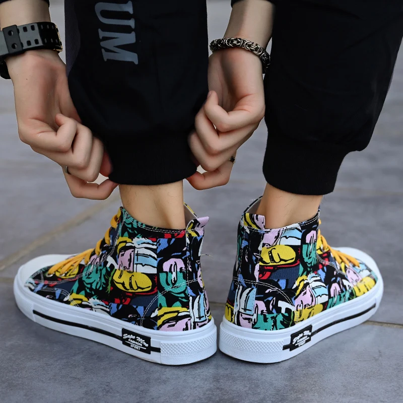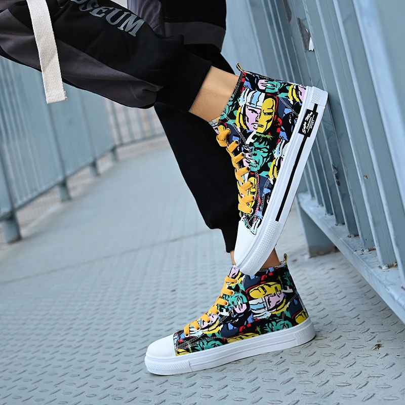 Мужские парусиновые туфли с высоким берцем, черные, с принтом, вулк...