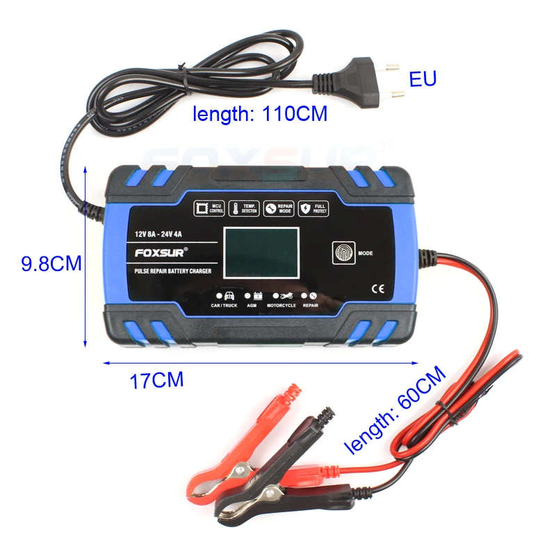 Зарядное устройство Foxsur, 1224 В, 48 А, умная зарядка, для автомобильных и мотоциклетных аккумуляторов AGM, гелевых, свинцово-кислотных, EFB, жидкостных, выбор тока зарядки