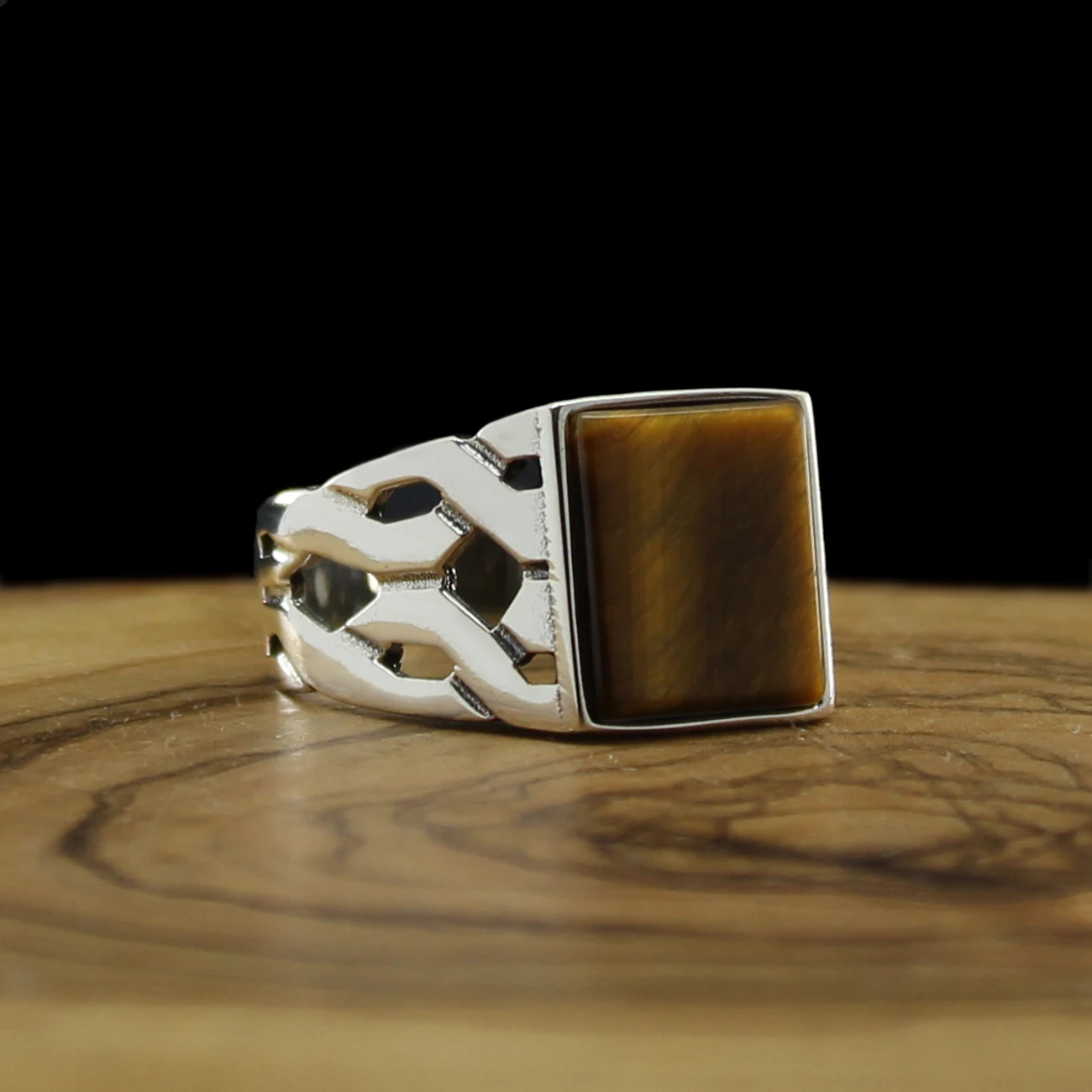 Мужское кольцо из серебра 925 пробы, с натуральным тигровым глазом