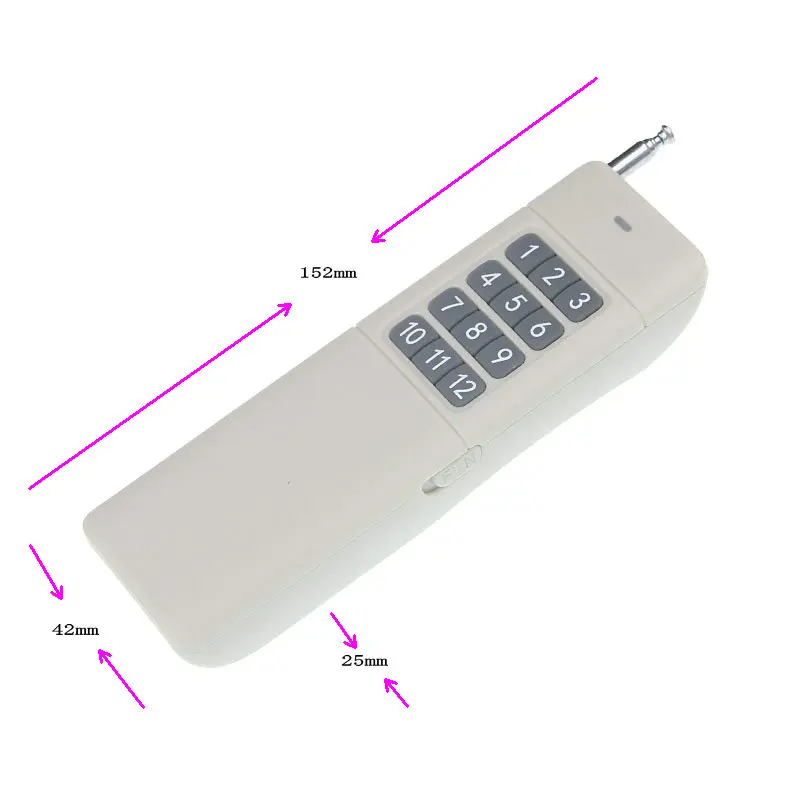 Этот переключатель разделен на 12 каналов. Это 12-клавишный передатчик для управления 12 комплектами приемников, 1 кнопочной трубкой и 1 набором приемников. Режим управления может выбирать только неблокировку или самоблокировку.