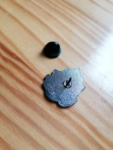 Мне нравится эта булавка, она очень милая. Однако он поставляется с резиновым штифтом сзади (как показано на рисунке), который склонен к соскальзыванию. Таким образом я потерял свою предыдущую булавку, поэтому мне пришлось купить новую. Я также купил металлические спинки штифтов, которые очень хорошо удерживают Прикрепленный штифт.