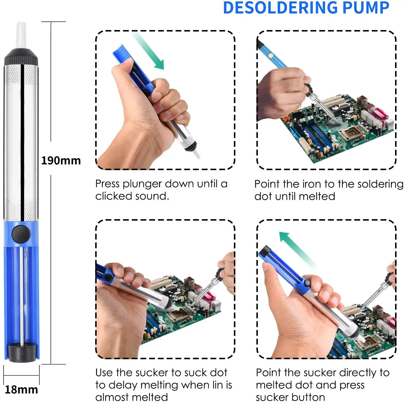 Паяльник с переключателем ВКЛ./ВЫКЛ.-паяльник 110 В/220 В 60 Вт с регулируемой температурой использует технологию индукции керамического сердечника, быстро нагревается, регулируемая температура с большими отверстиями для вентиляции. Может быстро нагреваться в течение 30 секунд, благодаря включенному/выключенному выключателю это позволяет экономить энергию и обеспечить безопасную сварку. Изоляционный чехол из силикагеля эффективно защищает железо от перегрева или падения【Обновленная машина с одной рукой для демонтажа-прочная металлическая конструкция, устойчивость к ударам и коррозии. Отключающий насос представляет собой вакуумную трубку высокого давления с алюминиевым корпусом, что позволяет легко использовать одной рукой. Вакуум высокого давления может эффективно удалять припой с печатной платы[Большие размеры 11-в-1 паяльник Kit】-паяльник Комплект поставляется с паяльник, припой проволока, отсос для припоя, с чистящей губкой, 5 несколько жал и PU Сумка для переноски. Этот набор инструментов может удовлетворить все потребности вашего паяльного проекта【 0,8 мм припоя Wire】-диаметр электрической припойная проволока 0,8 мм/0,031 дюймов, он весит 100g/0,22 фунтов лёгкий нейлоновый трос, Общая длина составляет около 57 м, который используется для длительного времени. Легко паять, плавно течет, пайка быстрая и сильная точка пайки【Application】-наборы паяльников подходят для самостоятельного использования, различного ремонта электроники и печатной платы, сварки, ювелирных изделий, гитары, часов, проводки, мобильных устройств, компьютеров, небольших электронных работ, ТВ конденсаторы или аксессуары! Подходит для начинающих, для обучения, электроники и хоббитов