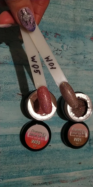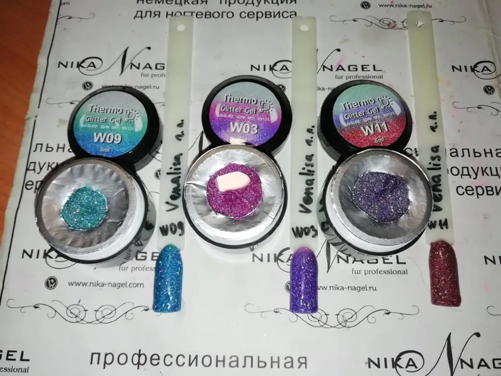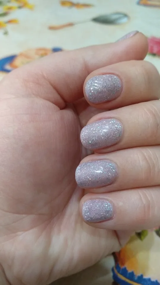 Термолак гель, надо 2-3 слоя, в баночке выглядит серовато сиреневым и в блесточках, на типсе к сожалению в 3 слоя блестки менее сверкают, разве что присмотреться. Может на солнце видно лучше. Когда рука теплеет, цвет меняется на светло розовый. В общем, подойдет если хочется что-то не яркое но и необычное. Мне медленнее надоедают такие лаки . Отмачивать не пробовала, снимаю фрезером.