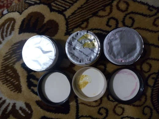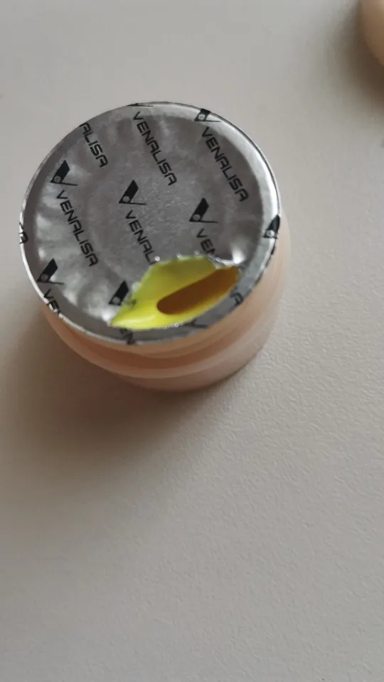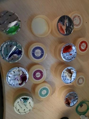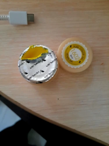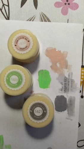 Баночки пришли целые, все прекрасено. Цвета красивые. Жёлтый полосит малость, а зелёный как видите более прозрачный. Синий вообще бомба. В работе опробованы некоторые цвета - все отлично. Однозначно закажу ещё)
