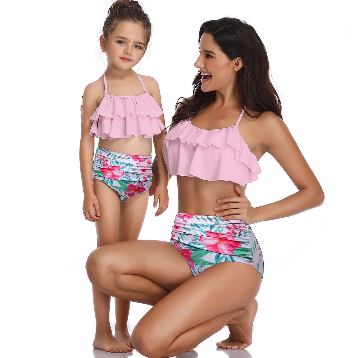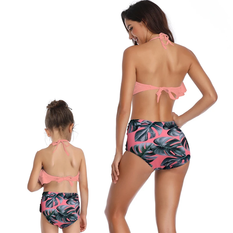 Title:Купальник для мамы и дочки, детские розовые бикини для девочек, пляжная одежда с высокой талией, бандажный купальник с лямкой через шею и оборками, купальный костюм с принтом, 2019