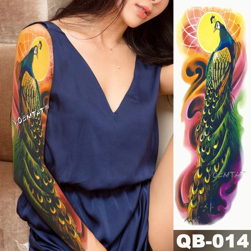 Новинка, 1 шт., временная тату-наклейка, красочная Татуировка Павлин Восход с подлокотниками, боди-арт, большой рукав, большая поддельная тату-наклейка