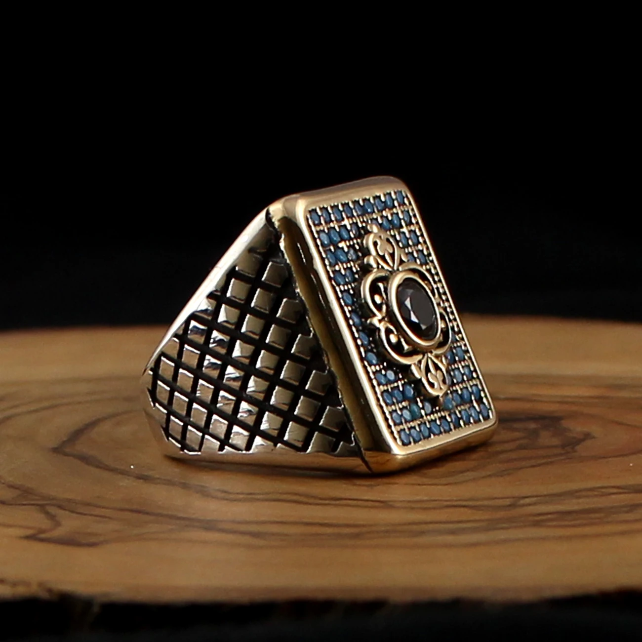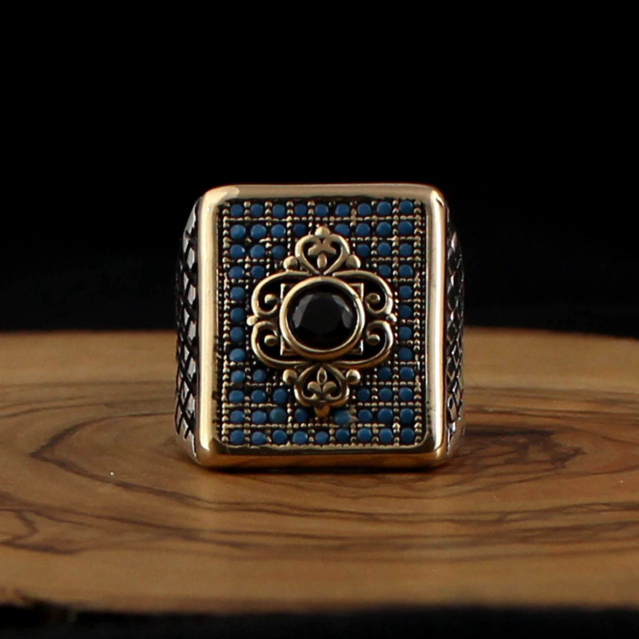 Мужское кольцо из серебра 925 пробы с натуральным черным Цирконом и бирюзовым камнем