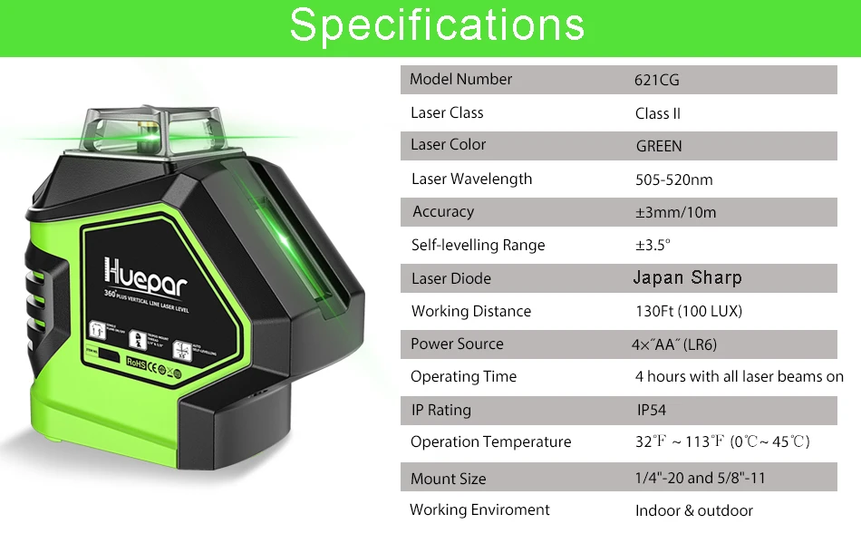 Все Лазерные уровни Huepar имеют 12 месяцев гарантии.