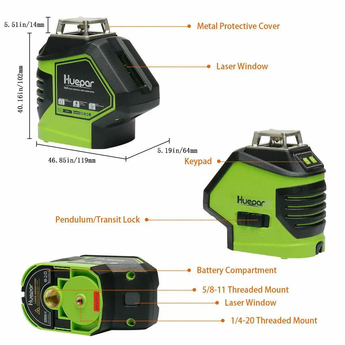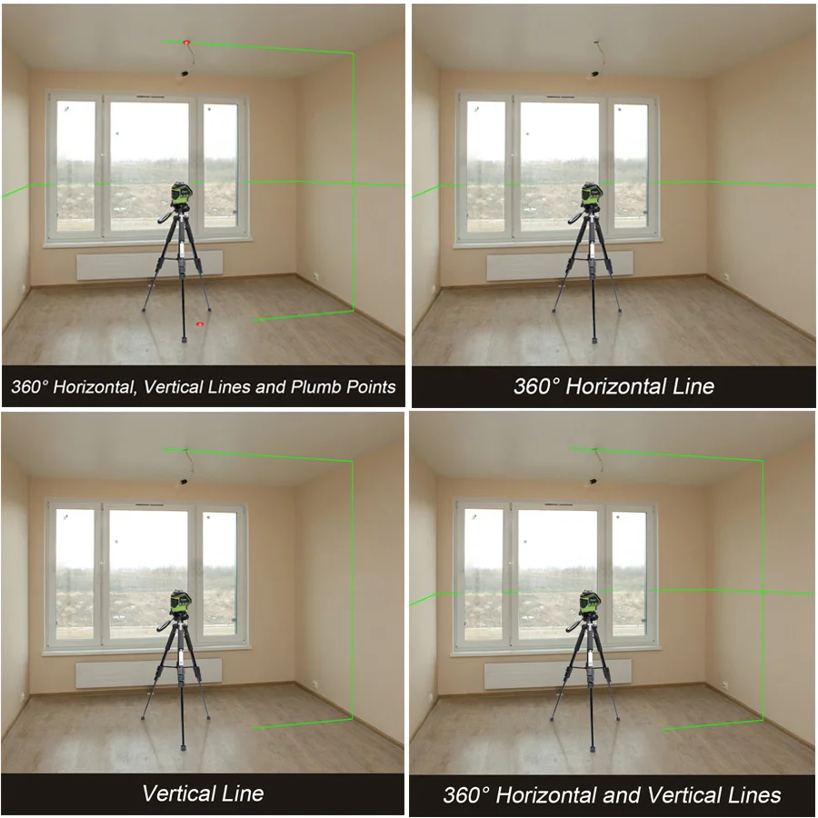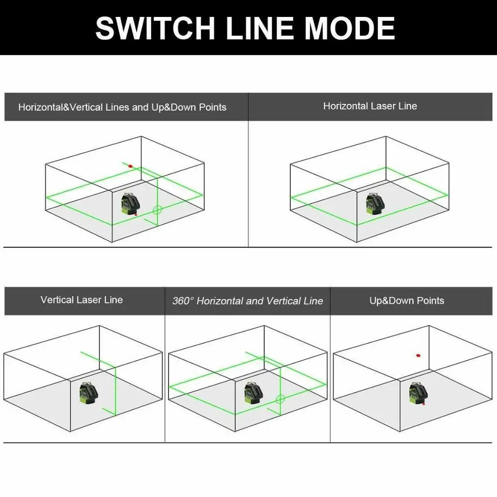 ✔Этот профессиональный перекрестный лазер проектирует одну горизонтальную линию на 360 ° и одну вертикальную линию на 140 ° для полного выравнивания покрытия, даже в большом месте работы.✔Этот лазерный уровень также проектирует точки вверх и вниз по центру на полу и потолке.✔③ Пять режимов можно свободно выбирать независимо: все лазеры в режиме, 360 горизонтальном режиме, вертикальном режиме, горизонтальном и вертикальном режиме и режиме точки отвода.
