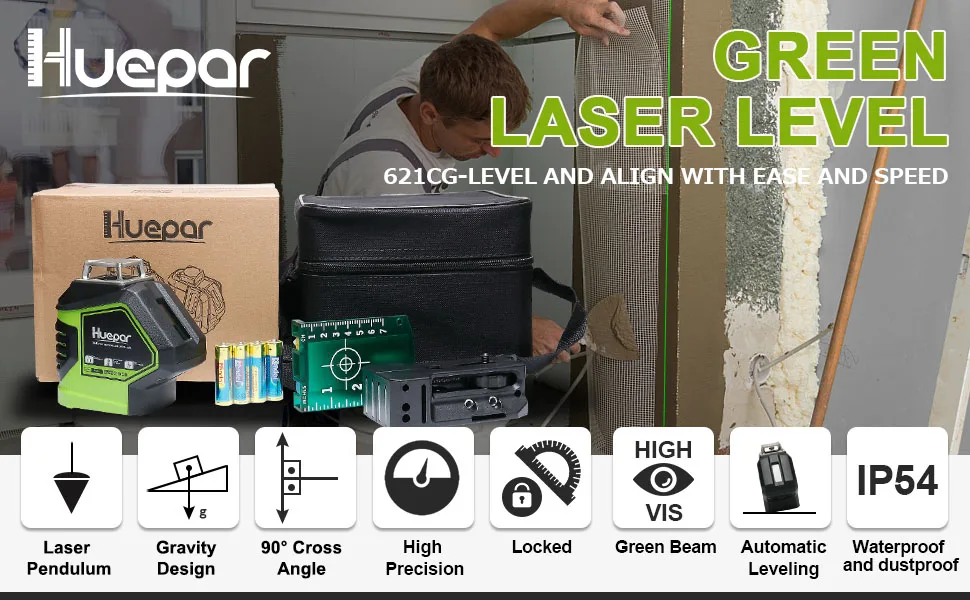 1 x Huepar 621CG зеленый самонивелирующийся перекрестный лазерный уровень1 x магнитное поворотное основание1 х Портативная сумка1 x Лазерная Целевая пластина1 x Руководство пользователя(Не включая батарею AA)