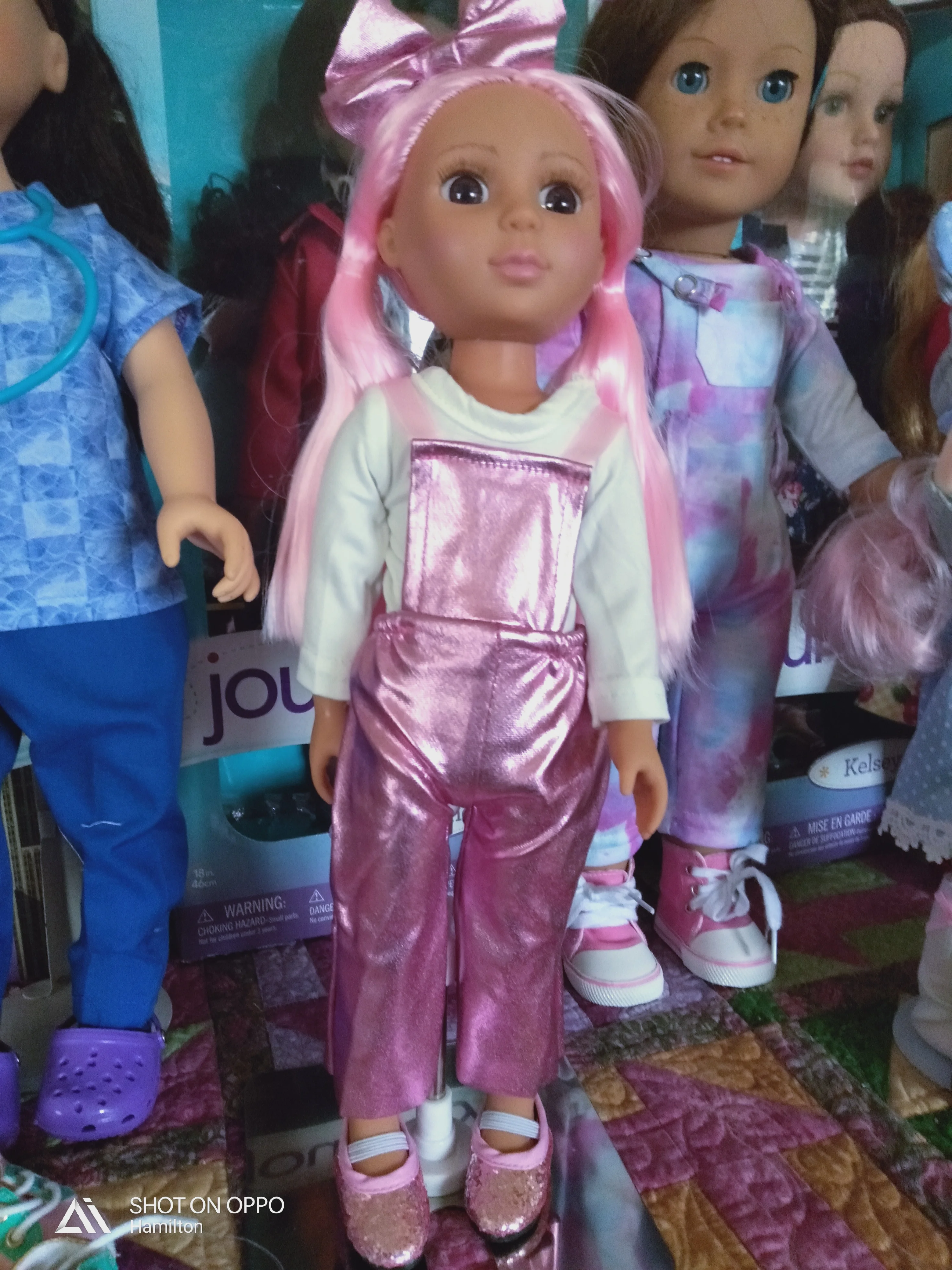 Мне очень нравится этот очень хорошо сделанный наряд. Очень хорошо подходит для моей 14-дюймовой куклы (может быть немного коротко) Но, ткань замечательная, блестящая и немного тянущаяся. У меня были небольшие проблемы с надеванием топа, штаны были достаточно легко надевать.