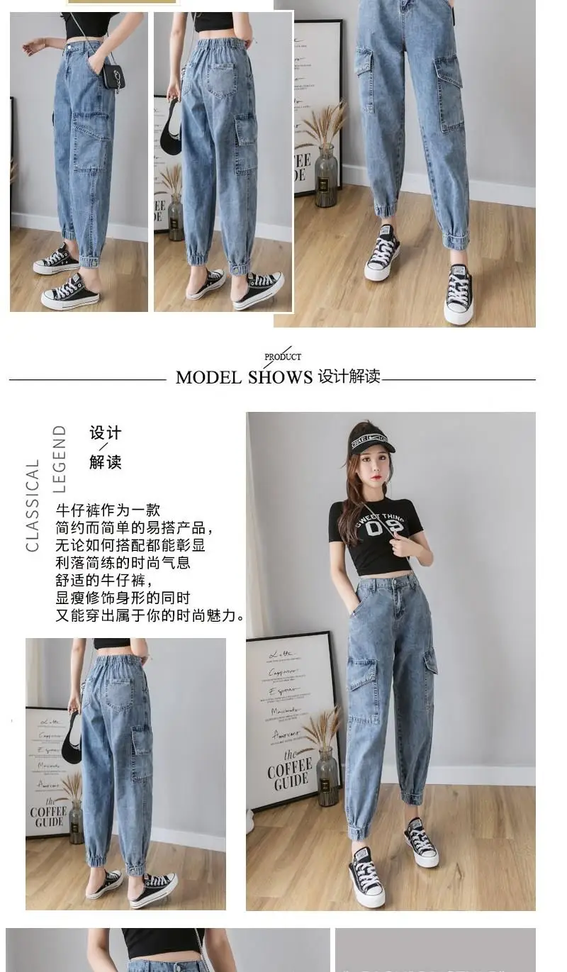 Женские джинсы-шаровары, с высокой талией, длиной до щиколотки, в стиле Харадзюку, в Корейском стиле, свободные, с большими карманами, на каждый день
