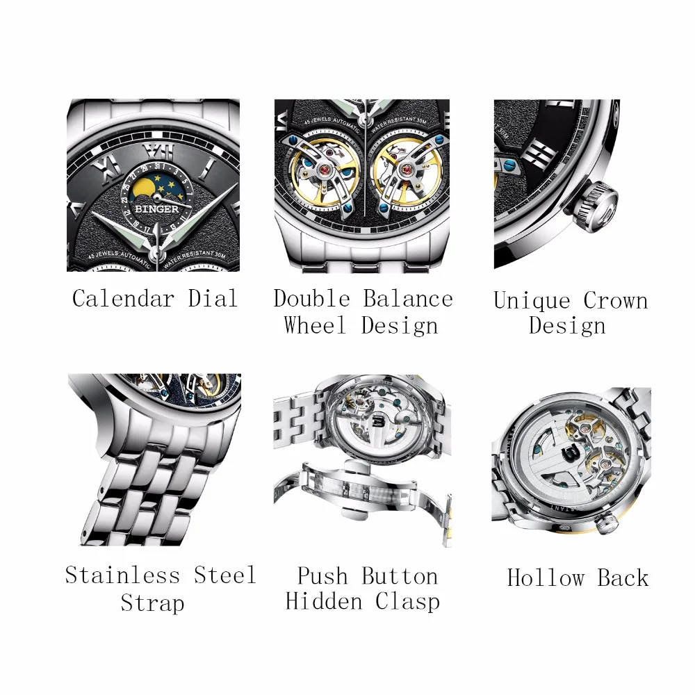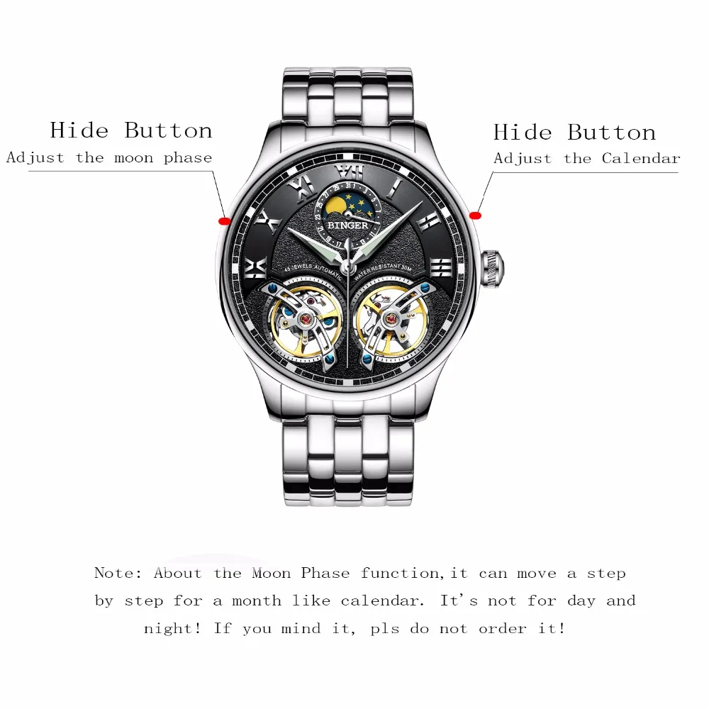 Tourbillon Switzerland BINGER Мужские автоматические часы, модные мужские механические наручные часы, мужские часы