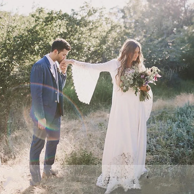 Горячая Распродажа Бохо пляжные свадебные платья с длинным рукавом колокол кружева цветок свадебные платья размера плюс хиппи богемное свадебное платье дешевый жилет