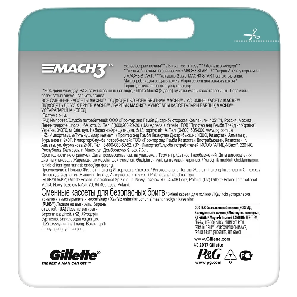 Сменные кассеты для мужской бритвы Gillette Mach 3 оснащены лезвиями прочнее, чем сталь, которые дольше сохраняют остроту (по сравнению с Sensor3). Более острые режущие лезвия (первые 2 лезвия по сравнению с Sensor3) рассчитаны на 15 процедур комфортного бритья. Эта бритва Gillette оснащена смазывающей полоской, которая скользит по коже, предотвращая ее покраснение, а защитный микрогребень Skin Guard растягивает кожу и подготавливает волоски к сбриванию. К мужской бритве Mach3 подходят все сменные кассеты Mach3.