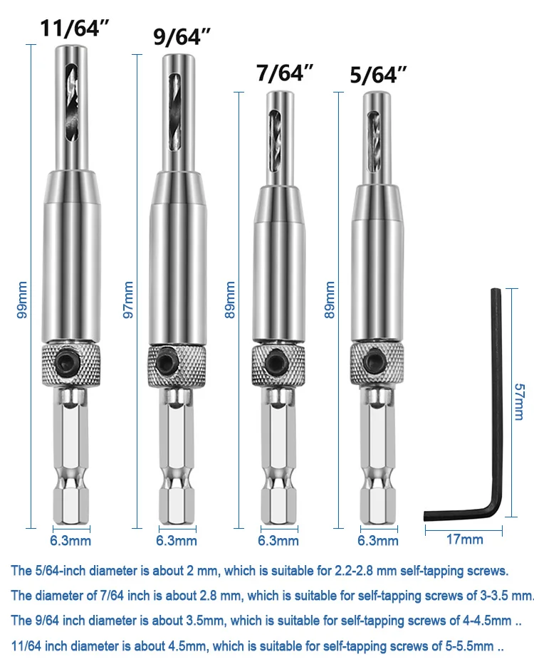 11/64 '': диаметр отверстия составляет около 4,5 мм, используйте нарезающий винт 5-5,5 мм