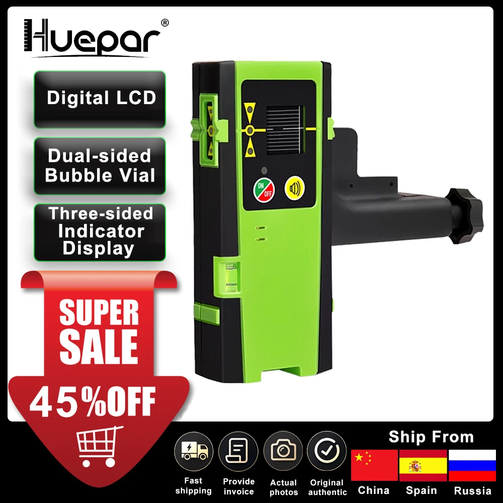 [Huepar выделенный приемник]-приемник Huepar LR-6RG может использоваться только с лазерным нивелиром Huepar. Обратите внимание, нельзя использовать для поворотного лазерного нивелира. Рекомендуется для использования в сопровождении Huepar 901CG/902CG/8211 г/кор.-1 г/кор.-1R/GF360G/GF360R/622CG/622CR/621CG/621CR/602CG/602CR/603CG/603CR лазерный уровень.[Доступно для красного и зеленого импульсного лазера]-Включите импульсный режим лазерного нивелира, затем лазерный приемник Huepar LR-6RG позволяет обнаруживать красные и зеленые импульсные лазерные лучи в сложных условиях освещения, расстояния до 60 м.[Четкое многостороннее чтение]-эргономичный дизайн с дисплеем спереди, сбоку и сзади приемника обеспечивает легкое визуальное чтение. Этот блок оснащен двухсторонним пузырьковым флаконом как спереди, так и сверху, для того, чтобы более точно определить уровень.[Точные оптические и акустические сигналы]-Этот лазерный приемник отличается удобным интерфейсом и умным дизайном. Оптический и акустический сигналы помогают быстро и точно определить местоположение лазерной плоскости. Светодиодный индикатор обеспечивает четкий и точный сигнал. Звуковой сигнал напомнит вам, когда вы найдете цель.[Длительный срок службы батареи и держатель зажима]-приемник поставляется с сухой батареей 9 В, обеспечивая вам около 70 рабочих часов. Также есть функция автоматического отключения, которая выключает устройство примерно через 8 минут работы в режиме холостого хода, чтобы продлить срок службы батареи. Прикрепленный Сверхмощный зажим позволяет легко установить детектор на стержень или другую целевую точку.