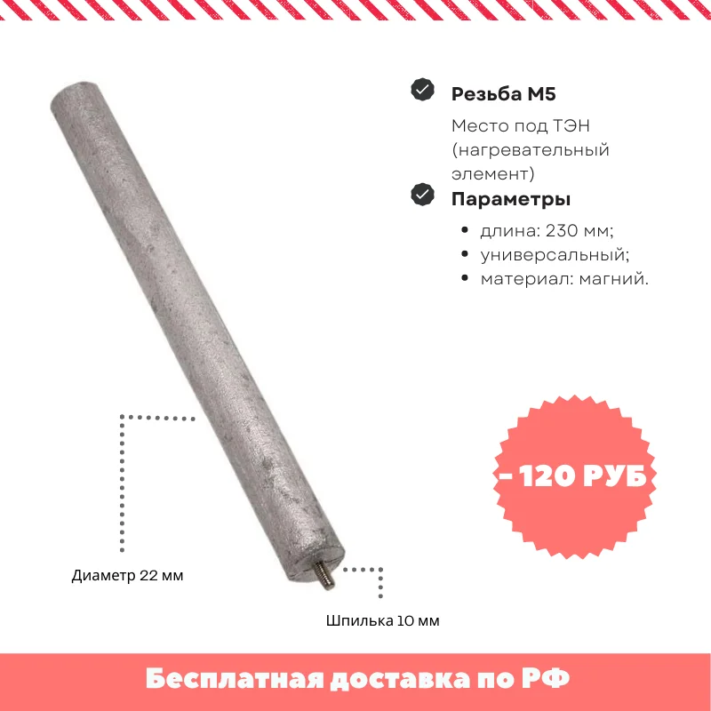 Анод магниевый стержень для тэна водонагревателя М5, длина 230 мм, диаметр 22 мм