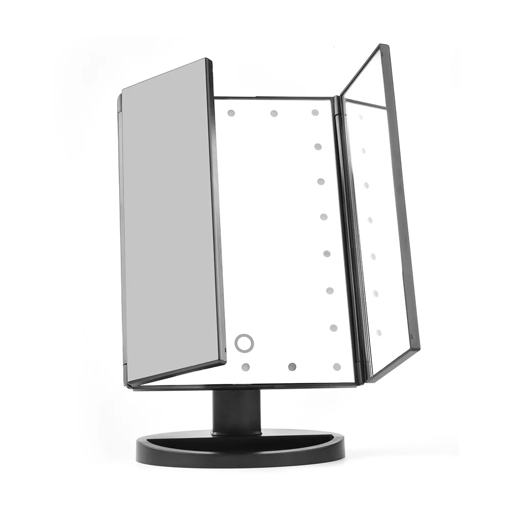 Размер: 28*19*7 смМатериал: АБС + стеклоСветодиодный светильник: 22 шт. светодиодныйСредний Зеркало Размер: 7x9,2 дюймовБоковое зеркало Размер: 3,5x9,2 дюймовСветильник источник света: светодиодные лампыЦвет: белый, розовое золото, черныйПитание: 4 * AAA батареи (не входят в комплект) или USB зарядки.