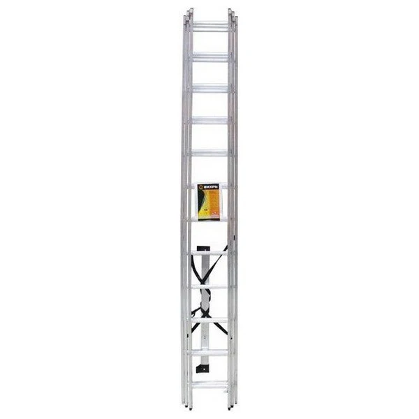 Лестница алюминиевая трёхсекционнаяПрочность и надежность при небольшом весе изделияСтойки и ступени изготовлены из прессованного профиляМногократная развальцовка в соединении ступеней со стойками обеспечивает высокую прочность и долговечностьРифленые ступени с шагом 260 мм для безопасного подъема и спускаАлюминиевые направляющие кронштейны надежно удерживают выдвижную секцию во всех рабочих положенияхЗацепы с автоматическим фиксаторомШирокая поперечная траверса обеспечивает высокую устойчивостьНадежно закрепленные на стойках и траверсе пластиковые наконечники препятствуют скольжениюВерхняя секция легко вынимается и устанавливается и может служить отдельной приставной лестницейФункция лестничных пролетов с использованием верхней съемной секцииХарактеристики:Количество ступеней: 12Количество секций: 3Материал: алюминийМАХ нагрузка: 150 кгВес: 15.7 кгРазмеры:Длина одной секции: 3.19 мДлина двух секций: 5.49 мДлина трех секций: 7.87 мМаксимальная рабочая высота одной секции: 4.45 мМаксимальная рабочая высота двух секций: 5.9 мМаксимальная рабочая высота трех секций: 8.85 мМаксимальная ширина (основание): 1 мМинимальная ширина (верх): 0.32 м