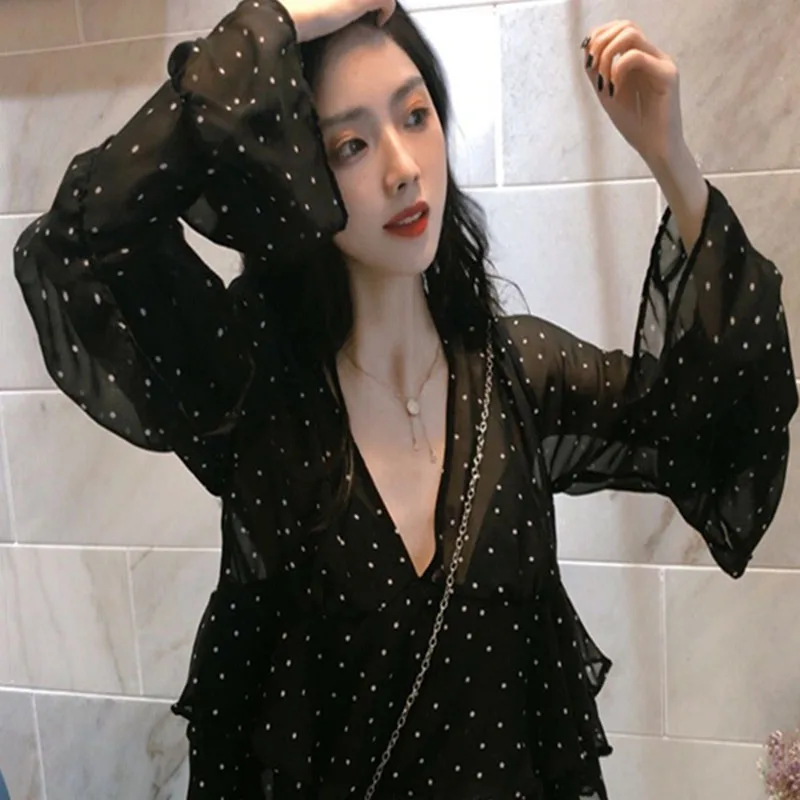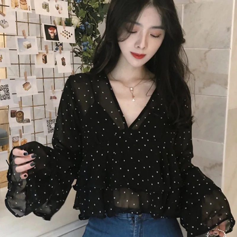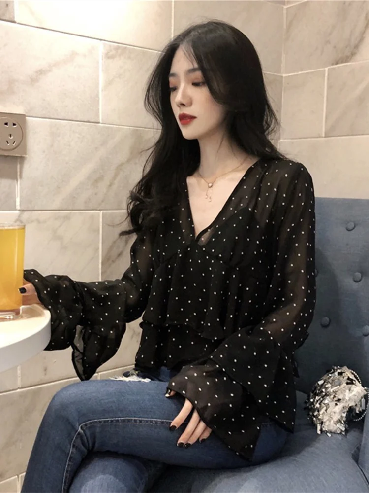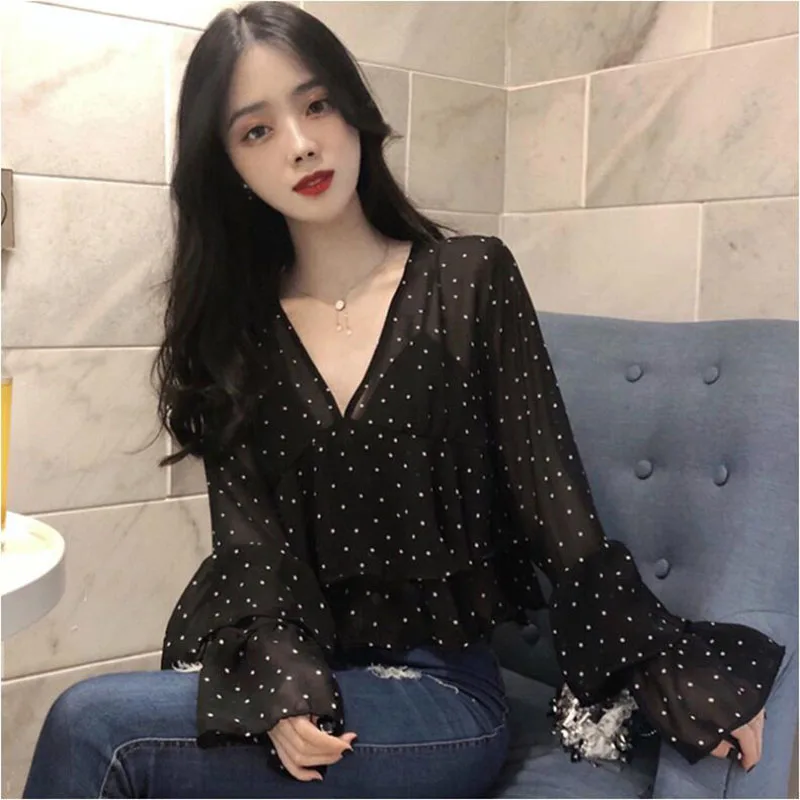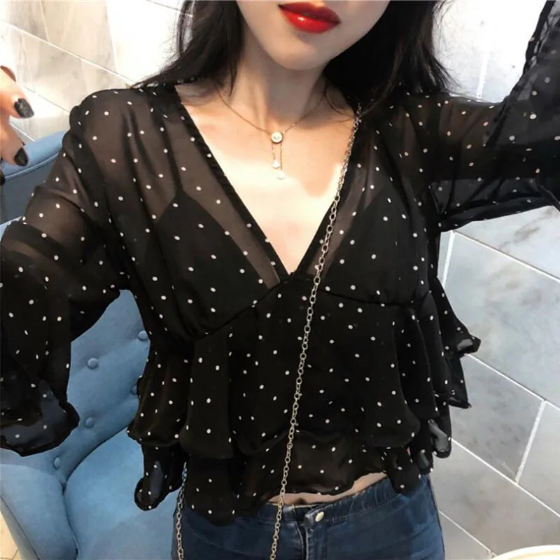 Блузки женские с V-образным вырезом, пикантные вечерние простые универсальные топы с расклешенными рукавами, повседневные короткие стильные элегантные рубашки в горошек с оборками