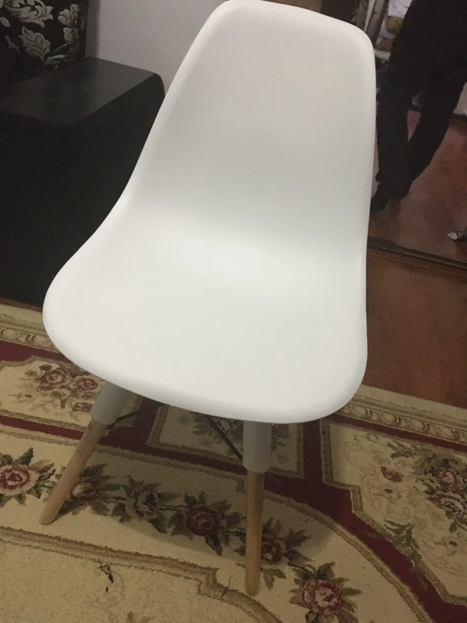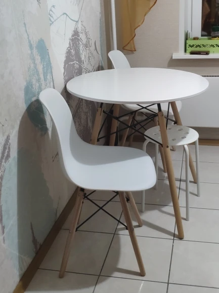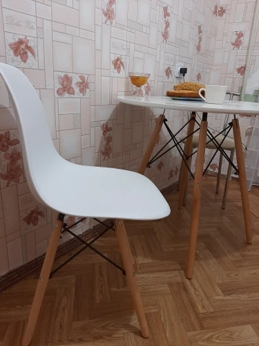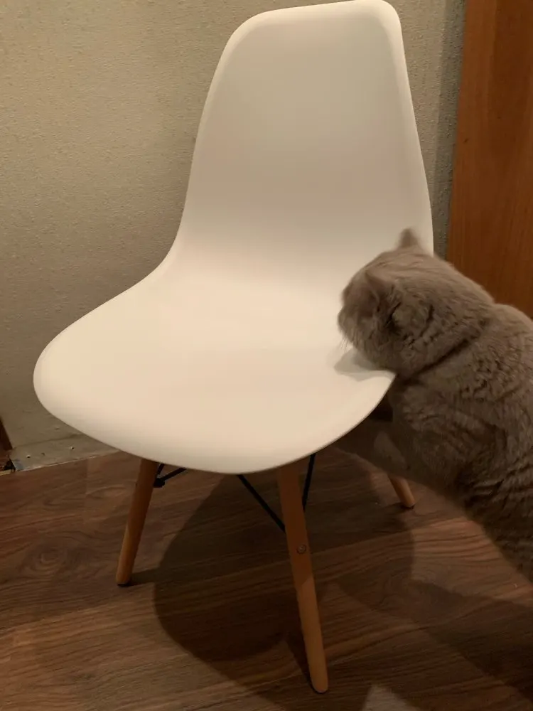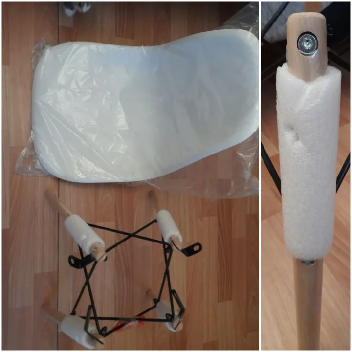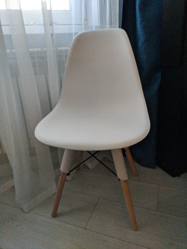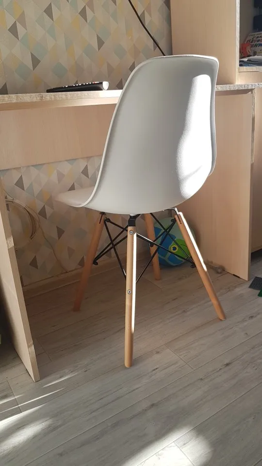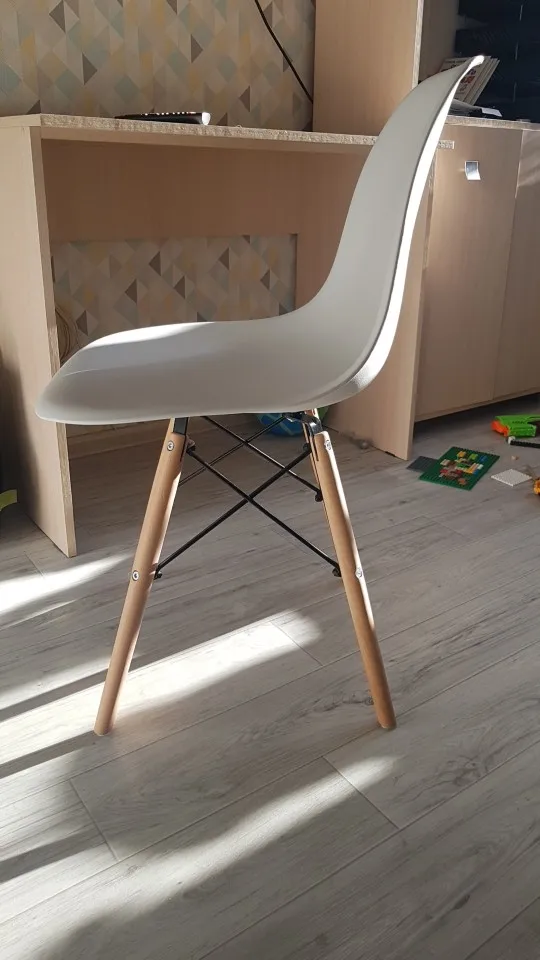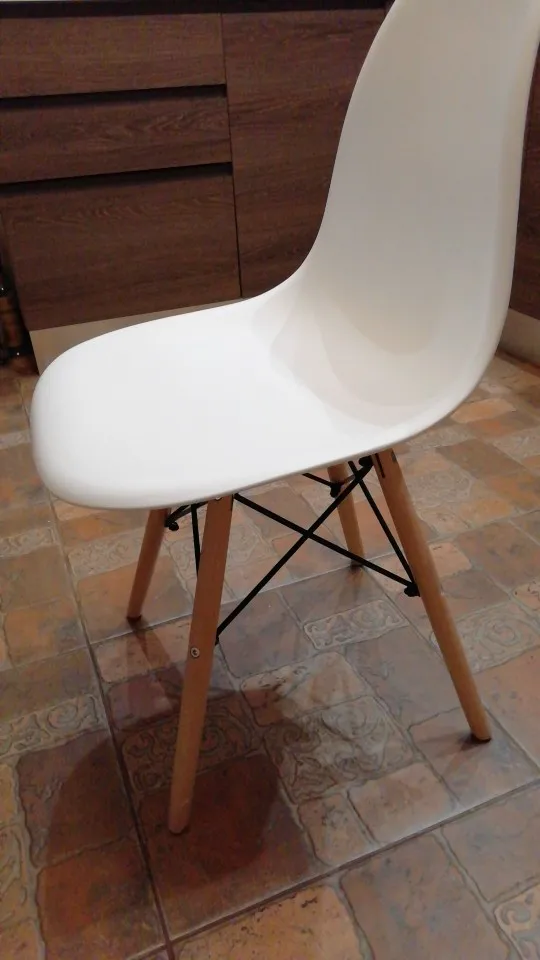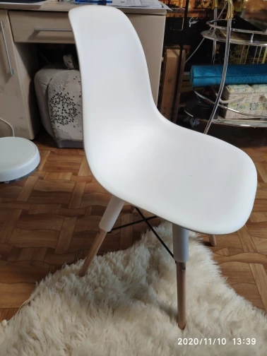 Пластиковый стул. Заказывала в день распродажи 11.11, была очень удивлена, что доставили всего за 10 дней! Продавец умничка. Ответил на все вопросы и отправил в пункт выдачи рядом с домом. Коробка с двумя стульями была большая, но легкая. Немного пробита, стулья оказались целы. Собрали 2 стула за 10 минут. Пластиковое белое сиденье, деревянные ножки и металлический каркас. Выглядит очень современно и красиво. Немного расстроило, что ножки на концах с пластиковыми вставками. Они продавливают линолеум. В целом впечатления хорошие!