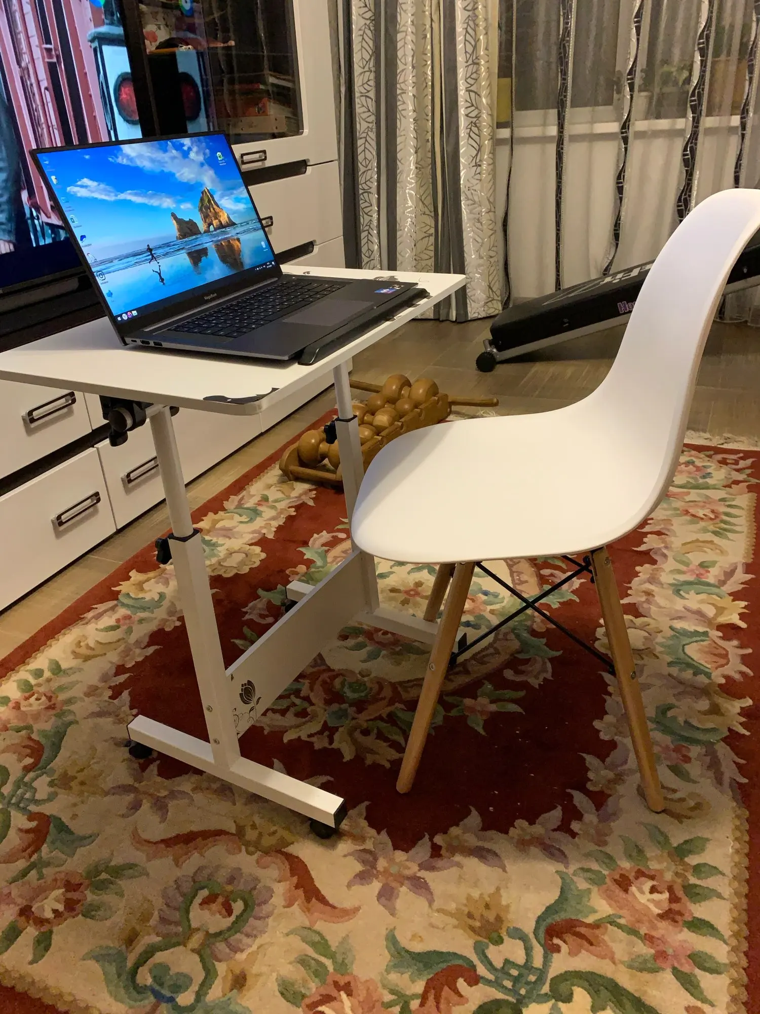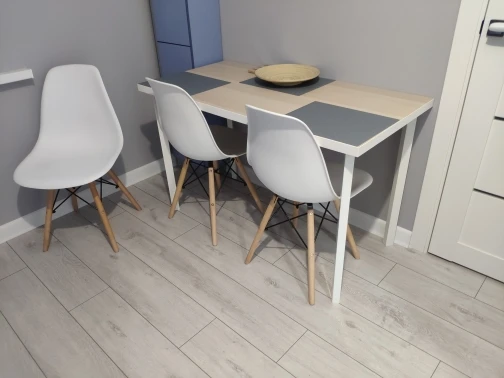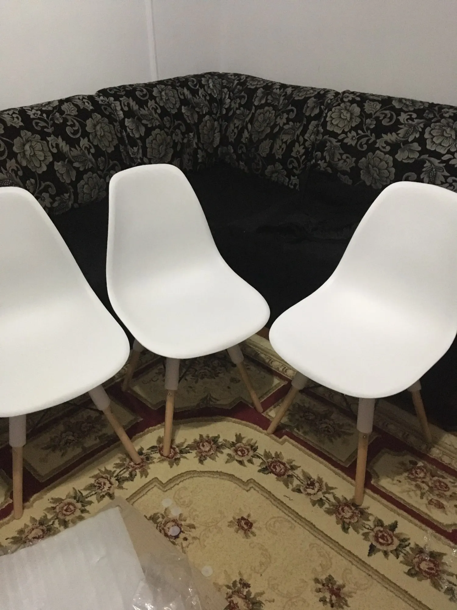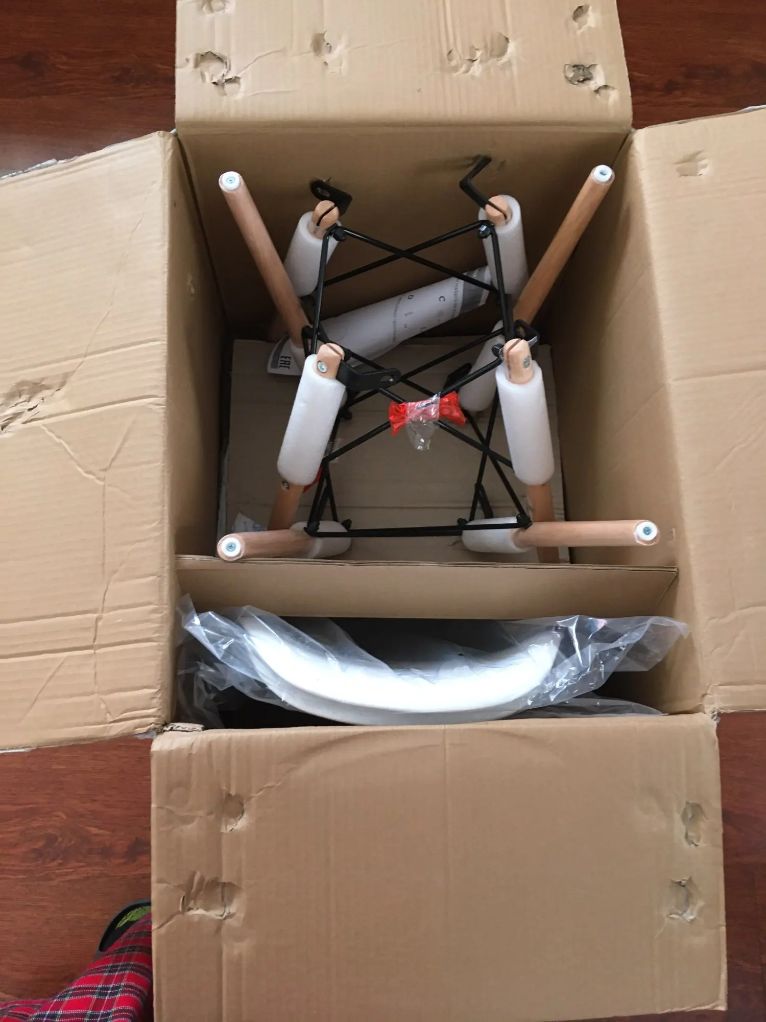 Пластиковый стул. Заказывала в день распродажи 11.11, была очень удивлена, что доставили всего за 10 дней! Продавец умничка. Ответил на все вопросы и отправил в пункт выдачи рядом с домом. Коробка с двумя стульями была большая, но легкая. Немного пробита, стулья оказались целы. Собрали 2 стула за 10 минут. Пластиковое белое сиденье, деревянные ножки и металлический каркас. Выглядит очень современно и красиво. Немного расстроило, что ножки на концах с пластиковыми вставками. Они продавливают линолеум. В целом впечатления хорошие!
