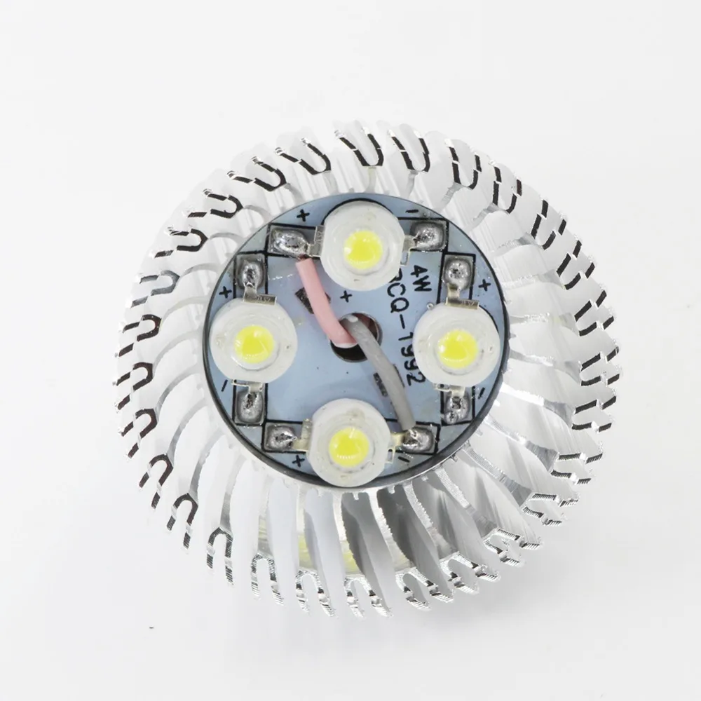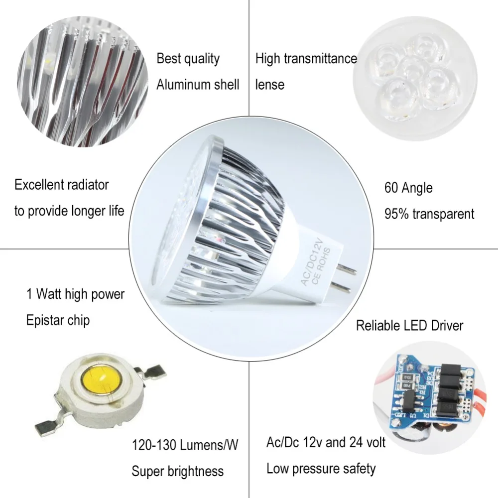 С 4 шт. 1 Вт Светодиоды высокой мощности, ультра яркость. Энергосбережение, низкое энергопотребление. Длительный срок службы, более 50000 часов. Защита для глаз, без стробов. Безопасно для использования, без излучения или элементов загрязнения. Высокое качество, стабильная производительность. Легко установить, просто подключи и играй. Подходит для паба, выставки, офиса или домашнего использования. Характеристики: Светодиод: 1 Вт Высокая мощность Количество светодиодных чипов: 4 Цвет света: теплый белый 3000 K/натуральный белый 4200 K/холодный белый 6000 K Люмен: 420лм Тип цоколя лампы: MR16