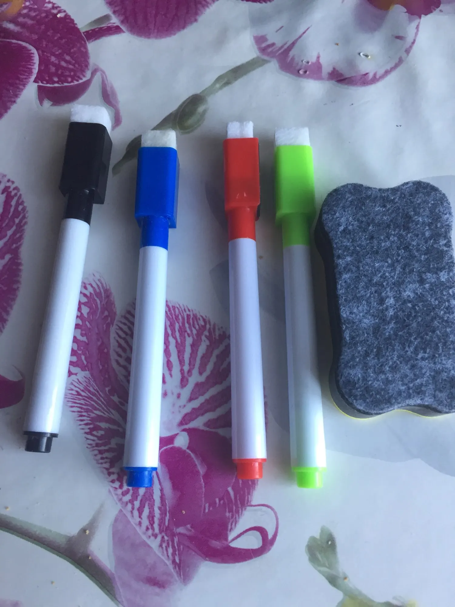 Все соответствует описанию. 4 маркера + "стирка". Посмотрим, как будет писать и стираться.