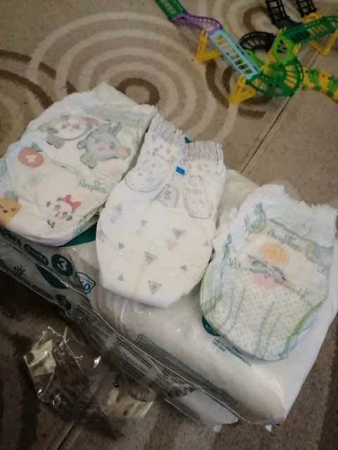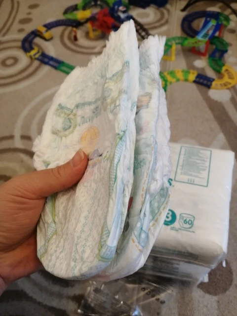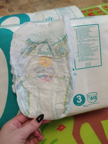 Приобрела за 1249р. Отправили быстро, а вот доставка задержалась на два дня, думаю потому что выпало на выходные. (Доставка в Новосибирск 3 дня, пришла через 5). О качестве. На фото для сравнения размер 4 (8-17кг). Тоесть они идут в размер, приятно. Мягкость средняя. Сын у меня 8800кг, 74см, подошли отлично, но в след раз уже возьму четвёрку. Так же на фото подгуз после использования ( 4 часа, три из них сна ). Не скажу, что он был в луже или мокрый наскозь, но салфетка осталось влажной. Сам внутренний слой, как то складывается по центру. С внешней стороны при наполнение, кажется холодным(влажным). По сути за 10р штука, пойдёт. При открытии пачки имеется запах ( не навязчивый, не противный). В прошлые разы на подгузы с запахом у нас были жуткие ожоги, с памперс все хорошо, никаких покраснений. Боковушки на трусиках довольно крепкие, не расходятся ( это важно с моим активным ребёнком :) Вообщем моя оценка 4.5/5. Советую. Мамочкам хороших и качественных покупок
