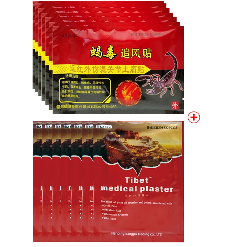 Посылка:80 шт яд скорпиона + 80 шт Медицинский пластырь ТибетаПодходящий объем: помощь в лечении кривизны позвоночника, периартрита плеча, растяжения поясничных мышц, боли в коленном суставе.Прекратите использование и обратитесь к врачу, если:1. Сыпь, боль или чрезмерное раздражение кожи.2. Условия ухудшаются.3. Признаки сохраняются в течение более 7 дней или очищаются и исчезают снова в течение нескольких дней.Как использовать:1. Мойте руки перед нанесением накладки.2. Очистите и высушите пораженный участок.3. Согните пластырь и Снимите пленку, чтобы разоблачить клейкую сторону.4. Нанесите клейкую сторону непосредственно на кожу в зоне воздействия.5. Используйте только один пластырь в зоне воздействия, патч может длиться до 8-12 часов.6. Мойте руки после удаления пластырей.7. Если боль устойчива через 8-12 часов после первой пластыри и второй пластырь может быть применен.8. Пожалуйста, удалите Первый патч перед нанесением нового.Инструкция по использованию пластырей для снятия боли