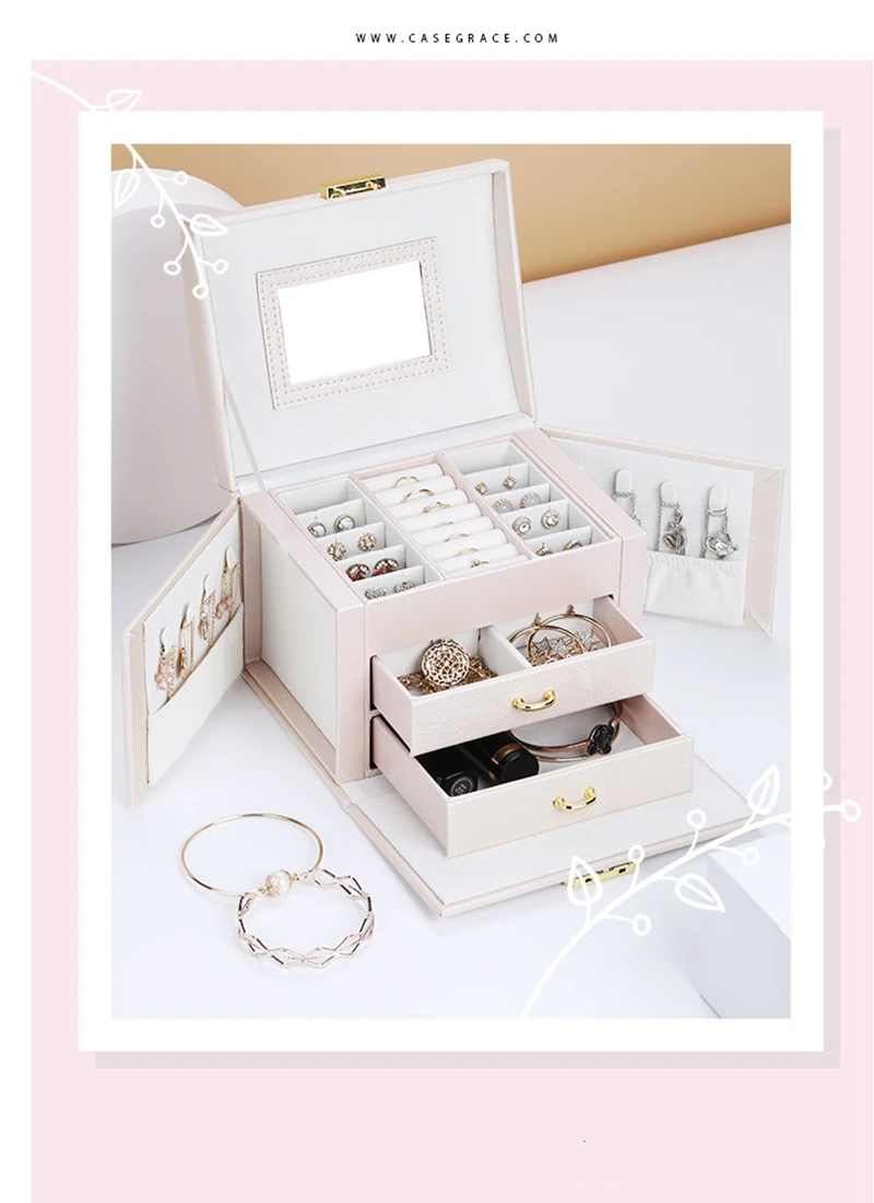 Шкатулка для драгоценностей, кожаная шкатулка для хранения ювелирных изделий, серег, кольца, ожерелья с зеркалом, органайзер для ювелирных изделий