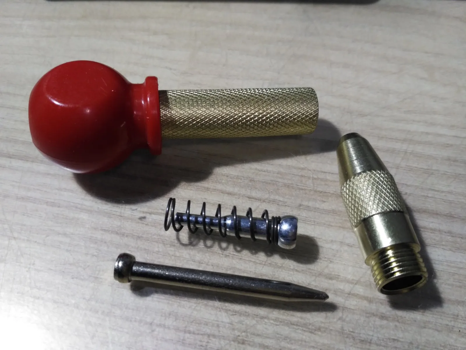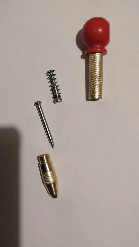 Хороший внешний вид и конструкция. Но!!! Боек сердечник, который ударяет острием в металл, то есть сам непосредственно керн сделан из мягкой нетвердой стали! Он затупился при первом же ударе о металлическую поверхность! Это как? Как же пользоваться таким инструментом? Точить после каждого кернения - абсурд. Заточил надфилем - сталь мягкая, некаленая. Не годный к применению инструмент. Если этот боек из углеродистой инструментальной стали, то можно его попробовать самостоятельно термообработать, закалить. Если сталь плохая по составу, то надо вытачивать новый из другого материала. А стоит ли прилагать столько усилий ради этого, решайте сами.