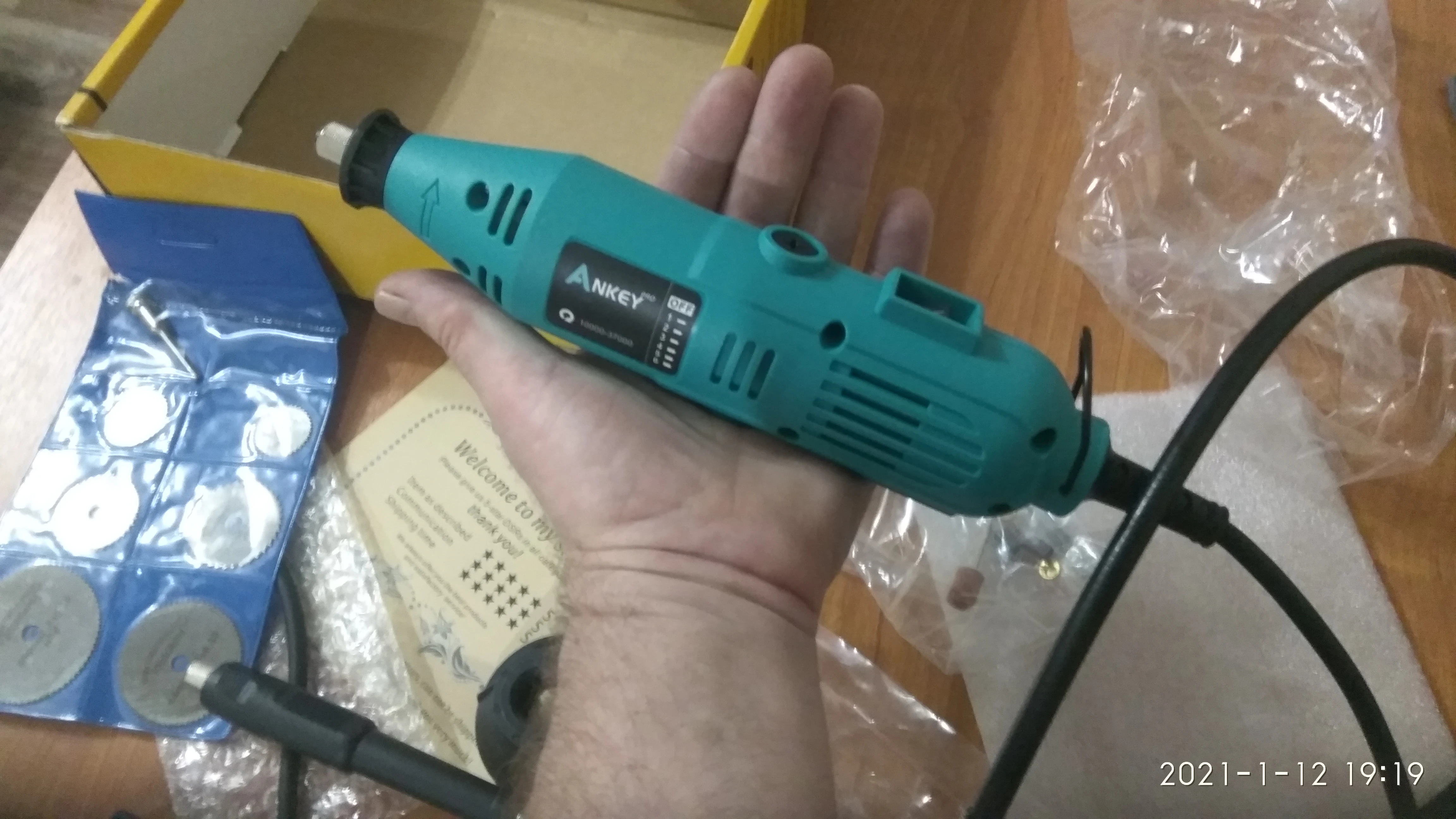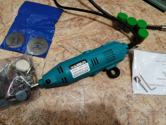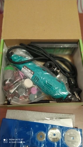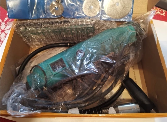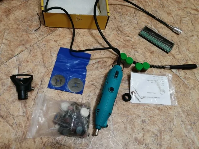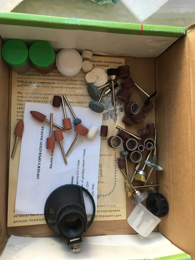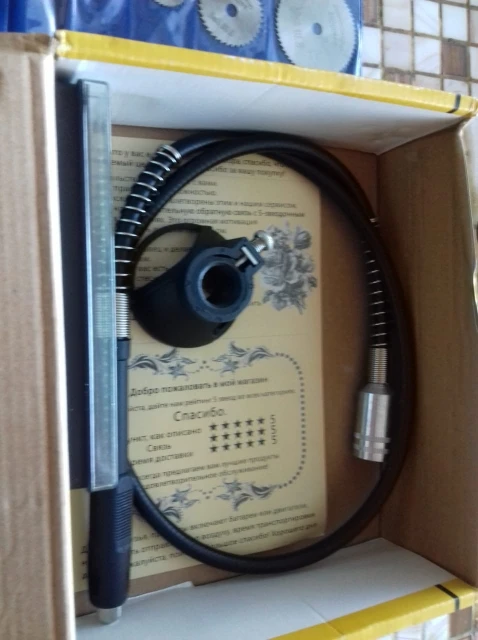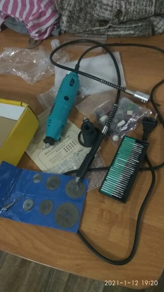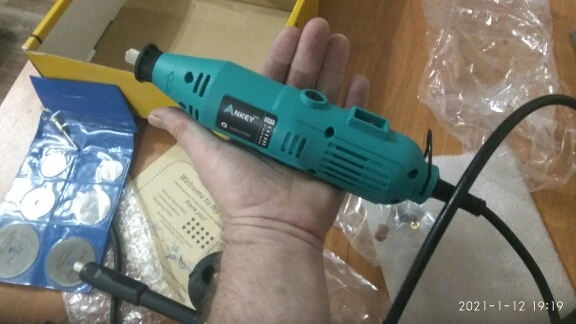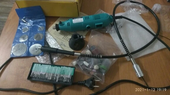 Заказал: 12 ноября 2020, Посылка прибыла в моё почтовое отделение г. Сочи: 13 январяря 2020. Упаковка: Картонная коробка от шуруповерта. Трек-номер отслеживался весь путь. Доставка СДЭК. Очень долго. Качество товара - нормальное. Большой комплект. Очень мягкий и достаточно длинный сетевой шнур - это плюс. Не забудьте смазать гибкий вал. Обороты регулируются плавно. "Ручка" гибкого вала и сама машинка на закрытых металлическими пыльниками подшипниках, хотел проверить в них смазку - не получилось, не хотел испортить металлический пыльник (лучше, если пыльник был - резина или пластик). "Ручка" гибкого вала и сама машинка - ощутимо греются в течении 5 мин шлифовки. Сама бормашина - очень, очень слабая. БИЕНИЕ довольно сильное и на машинке и на гибком валу, НЕОБХОДИМО: конусообразным камнем выровнять и отшлифовать фаску в месте посадки ЦАНГИ. ОБЯЗАТЕЛЬНО используйте ЗАЩИТНЫЕ ОЧКИ. МОЯ ОЦЕНКА машинке - 4. Всем удачи! Продавцу Спасибо!
