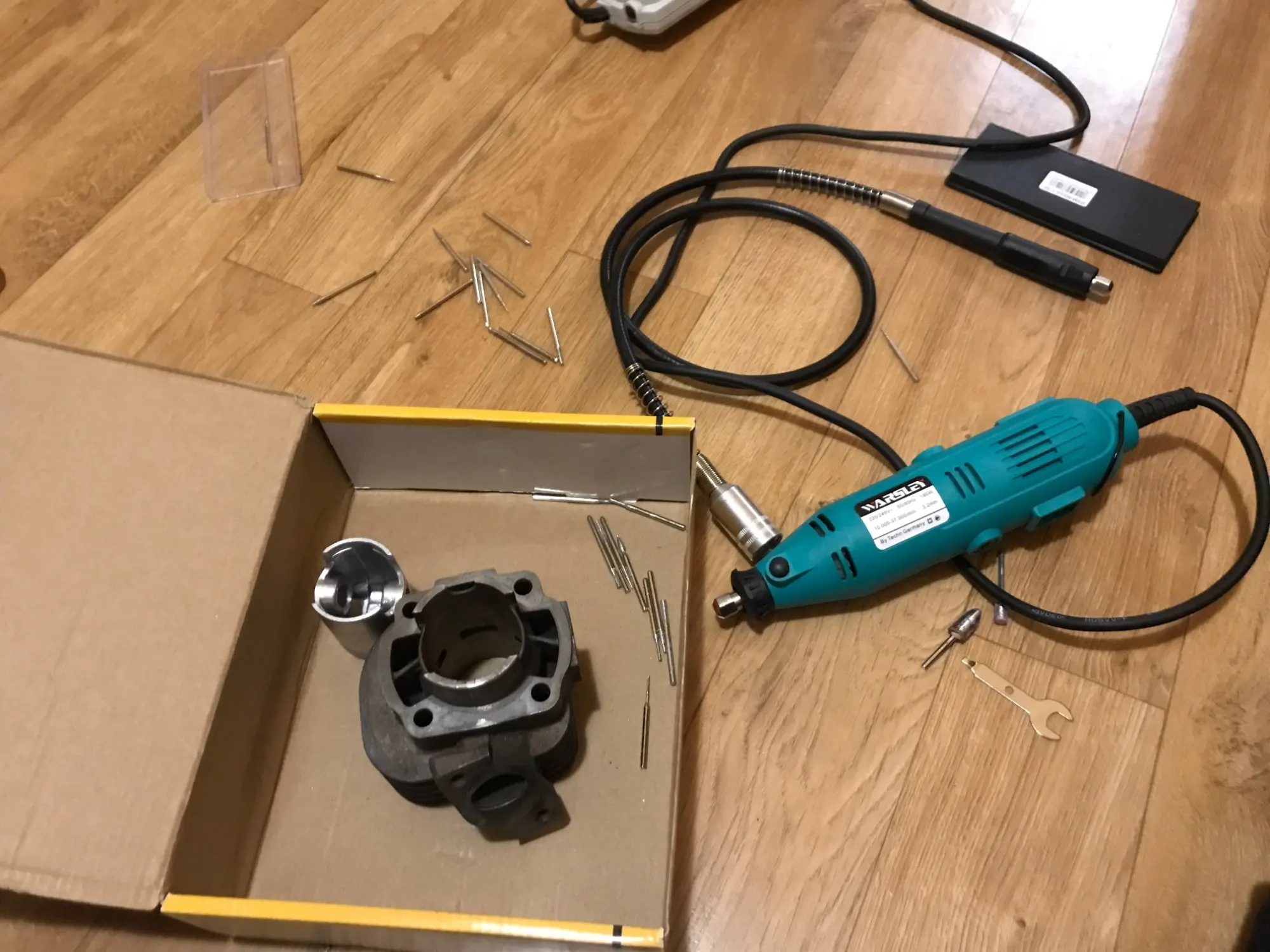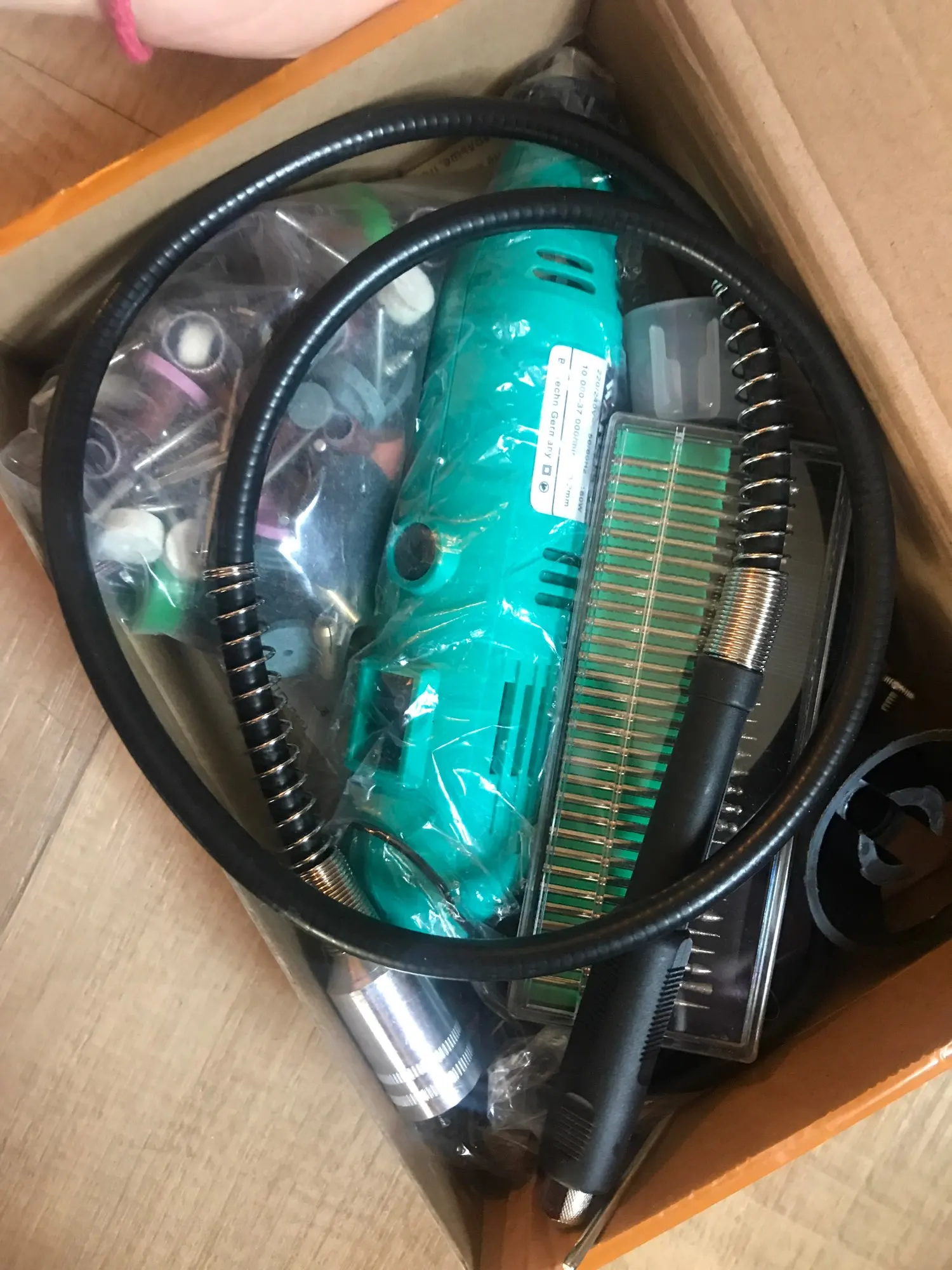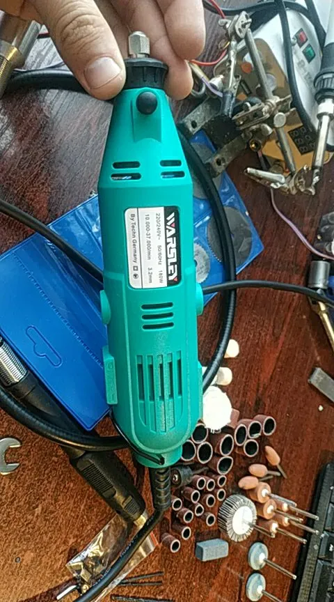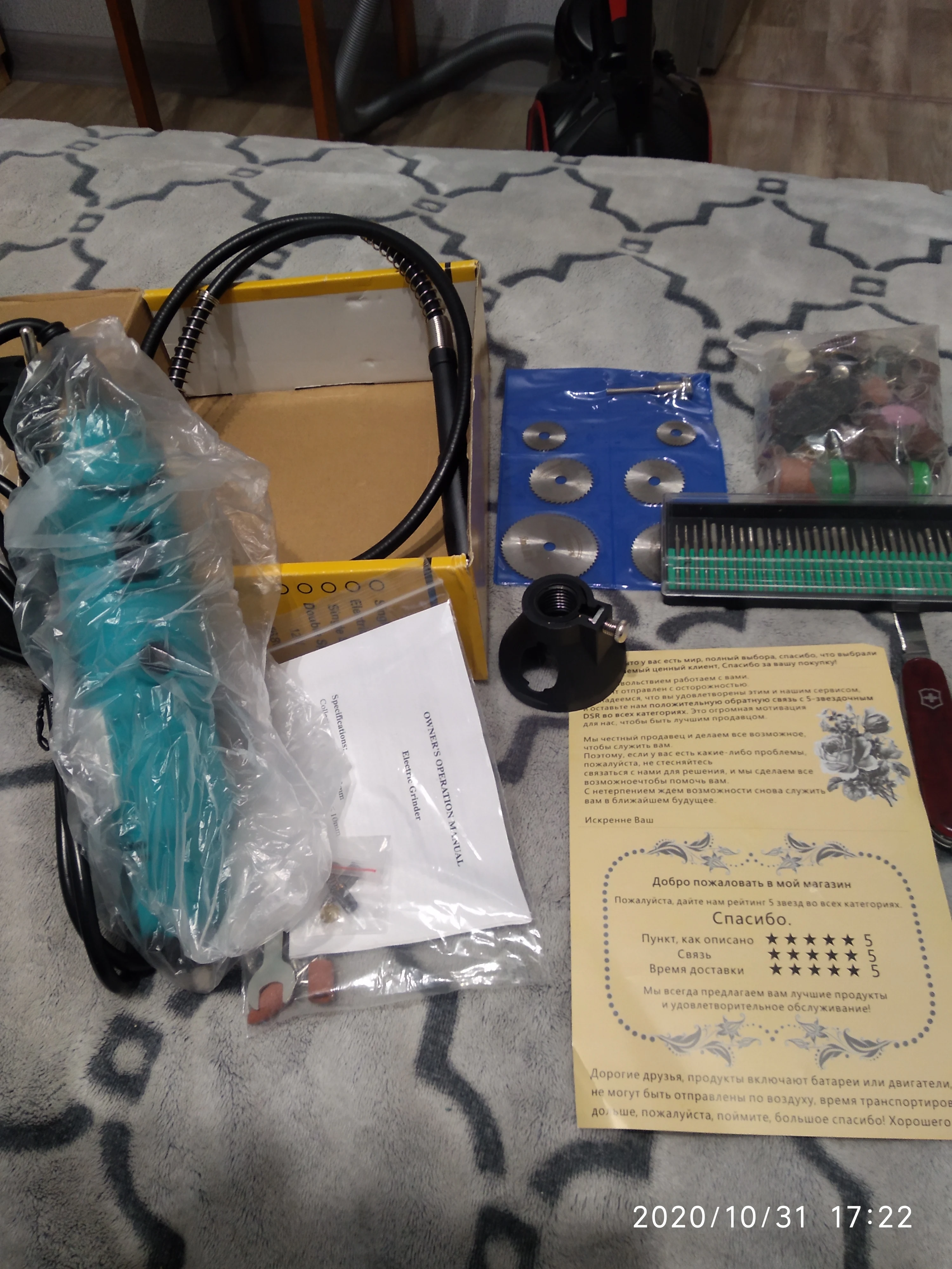 Заказал: 12 ноября 2020, Посылка прибыла в моё почтовое отделение г. Сочи: 13 январяря 2020. Упаковка: Картонная коробка от шуруповерта. Трек-номер отслеживался весь путь. Доставка СДЭК. Очень долго. Качество товара - нормальное. Большой комплект. Очень мягкий и достаточно длинный сетевой шнур - это плюс. Не забудьте смазать гибкий вал. Обороты регулируются плавно. "Ручка" гибкого вала и сама машинка на закрытых металлическими пыльниками подшипниках, хотел проверить в них смазку - не получилось, не хотел испортить металлический пыльник (лучше, если пыльник был - резина или пластик). "Ручка" гибкого вала и сама машинка - ощутимо греются в течении 5 мин шлифовки. Сама бормашина - очень, очень слабая. БИЕНИЕ довольно сильное и на машинке и на гибком валу, НЕОБХОДИМО: конусообразным камнем выровнять и отшлифовать фаску в месте посадки ЦАНГИ. ОБЯЗАТЕЛЬНО используйте ЗАЩИТНЫЕ ОЧКИ. МОЯ ОЦЕНКА машинке - 4. Всем удачи! Продавцу Спасибо!